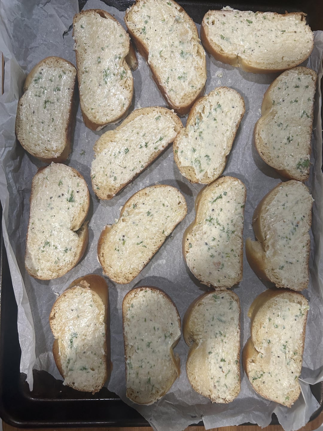 Slide 4: Freezer garlic bread. I got bread free from work, so I sliced some challah and added a garlic butter mixture to both sides for a copycat freezer garlic bread. This is my first time trying it, and I’m excited to try it!