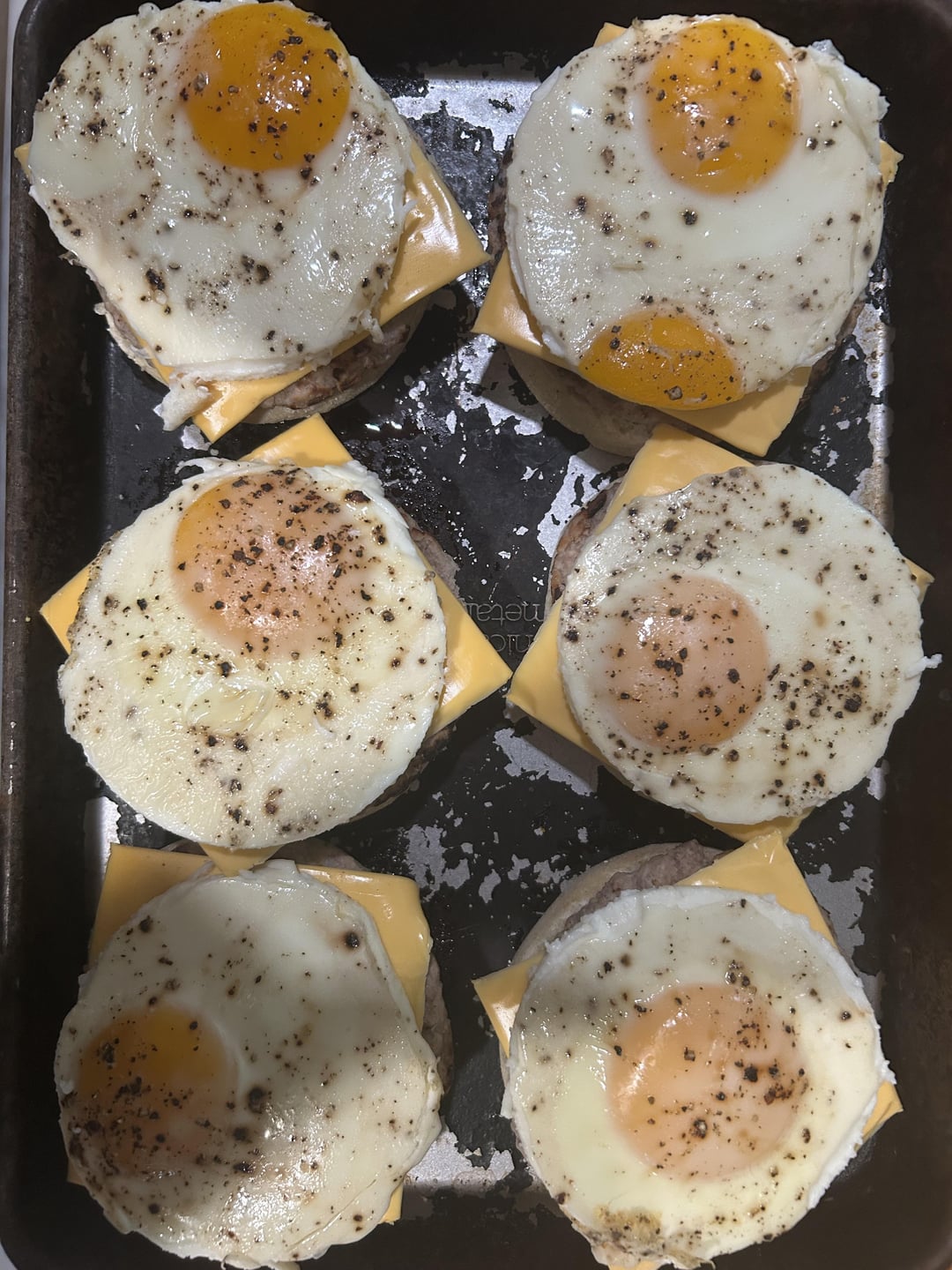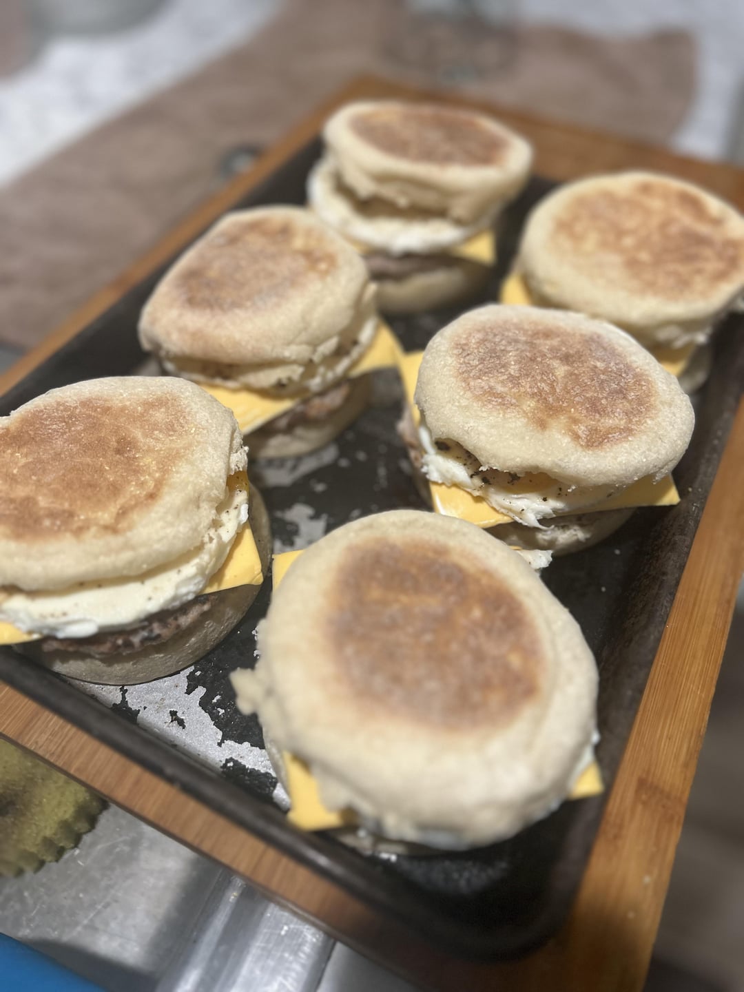 Slide 2/3: Freezer breakfast sandwiches: sausage, egg, and cheese. This one was straightforward! The sausage was from Aldi (7.75 for 18). I made sheet-pan eggs and then assembled and wrapped them.