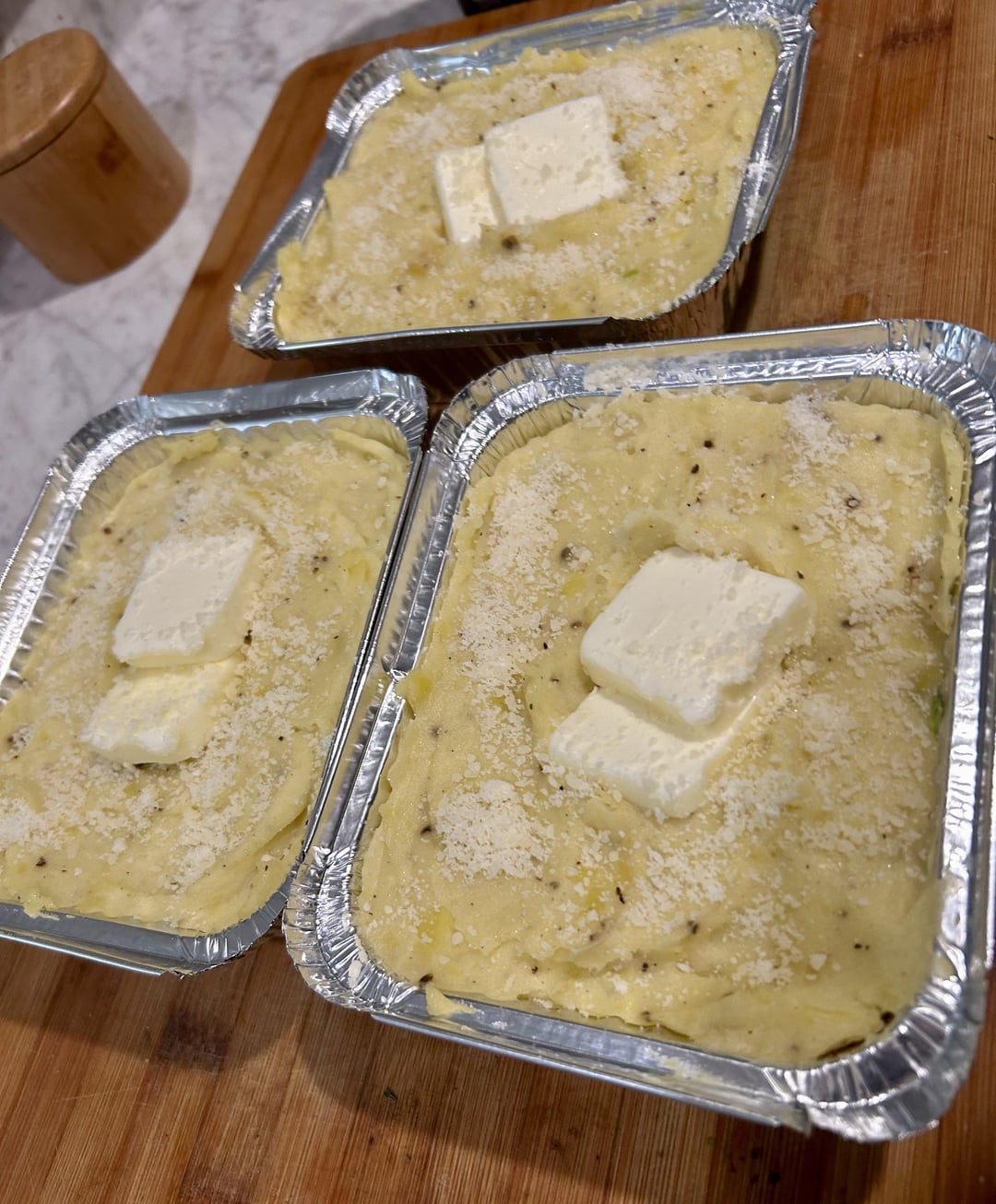 Slide 15: Mashed Potatoes: I used Yukon gold potatoes, milk, garlic, and Parmesan. Then, I topped them with two pats of butter and some extra Parmesan.