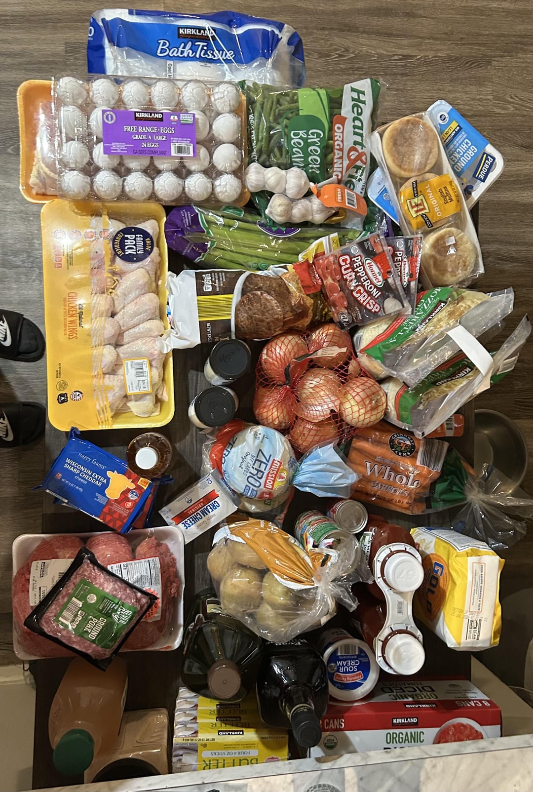 Slide 1: our grocery haul, about $278.91 total. Including a handle of whiskey and a 12-pack of off-brand cola (not pictured). We shopped at Costco (149.55), Aldi ($69.74), and Ralph’s (61.62).