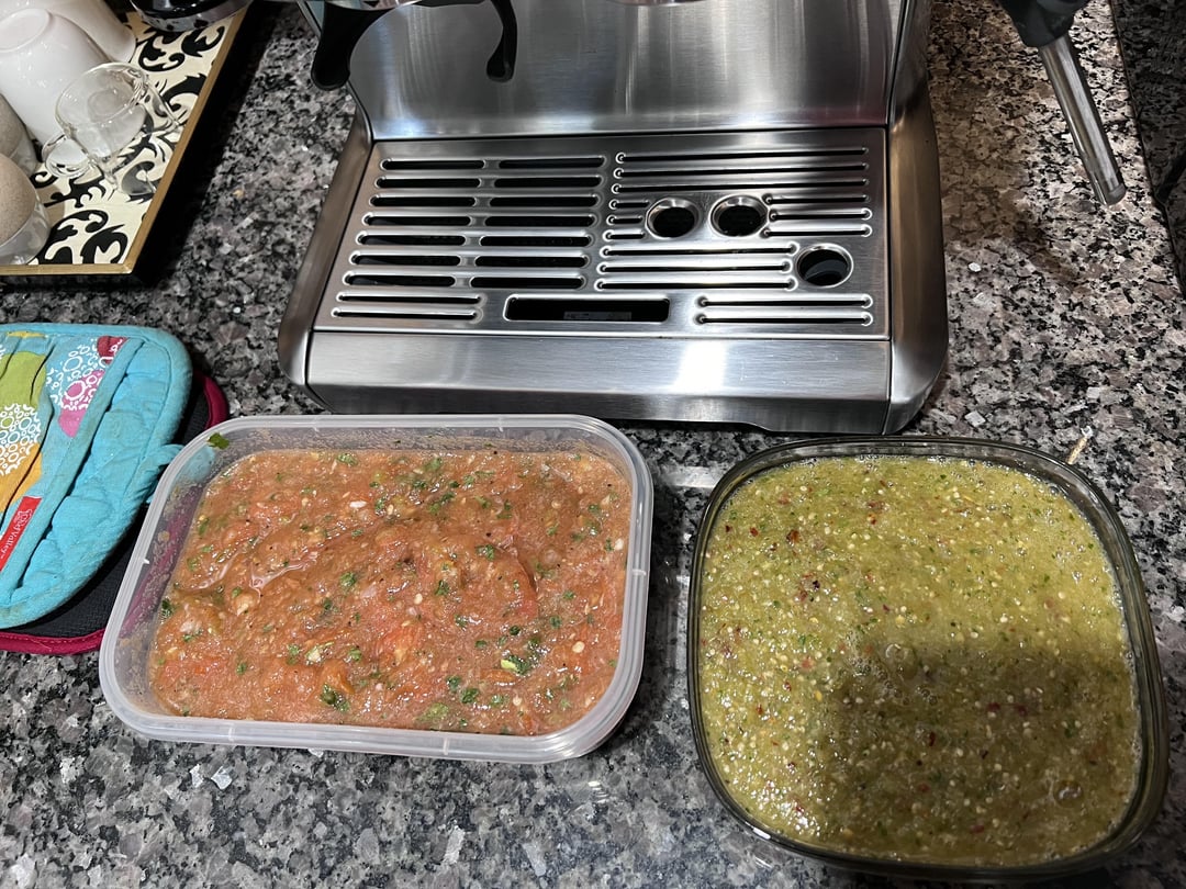 Roasted about 8 romas, two jalapeños, have a white onion, 3 garlic cloves. Blended with salt, a bunch of cilantro, a dash of cumin and juice of one lime.