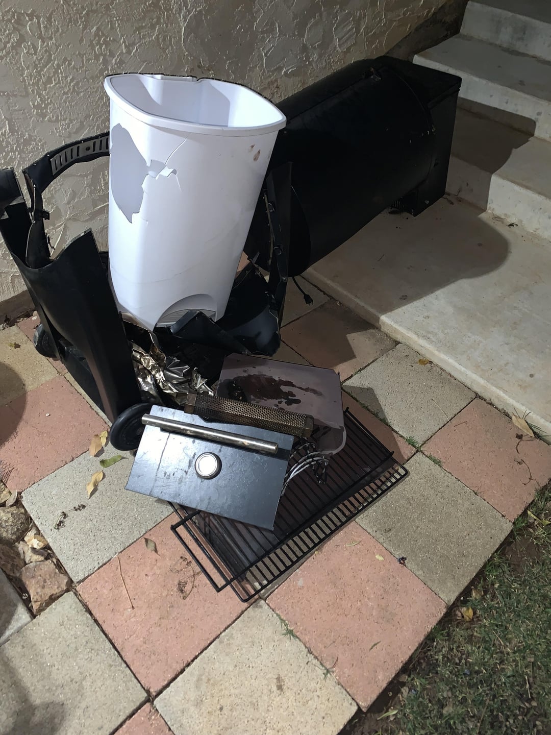 P.s. that hole in the trash can is from the blast, also apparently a piece of shrapnel got sent into a tree branch, breaking it loose