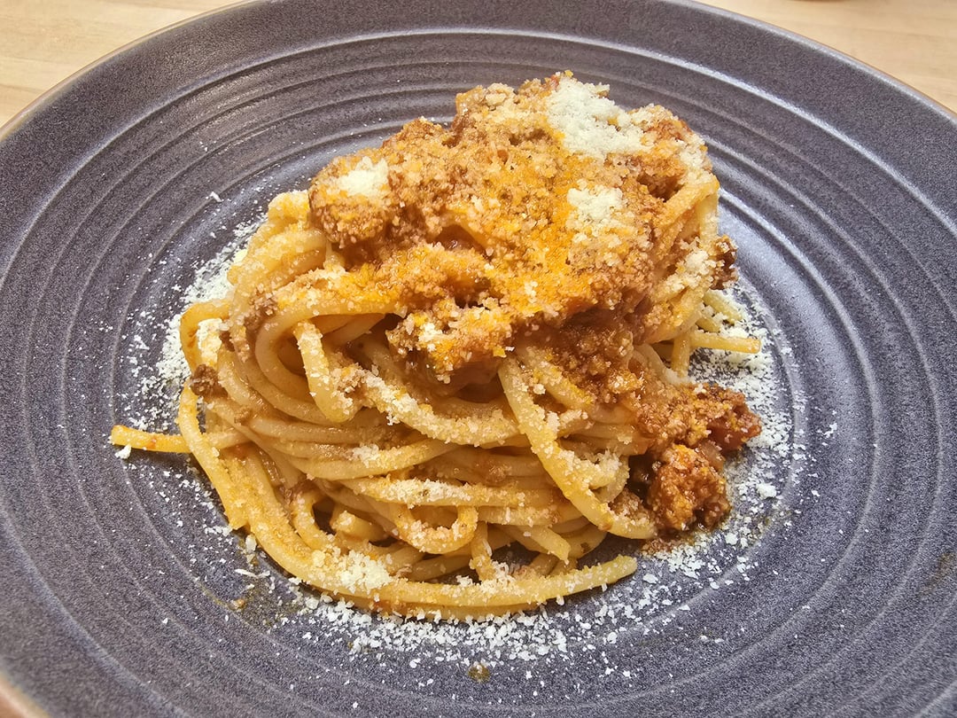 This was a nice, all afternoon on the stove spaghetti sauce. Ground beef, pork, and veal browned off, then onions and garlic, tomato paste, red wine, and crushed tomatoes. I added dried oregano and fresh basil, a small can of fire roasted diced tomatoes, and a parm rind. Simmered 7 hours until dinner time.