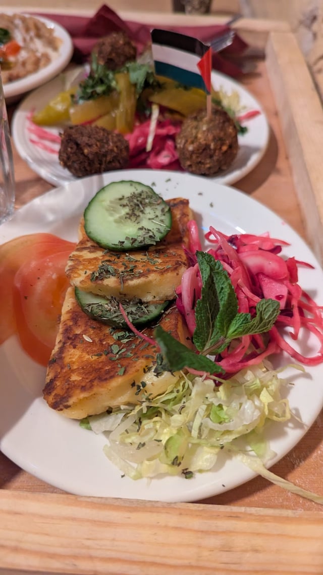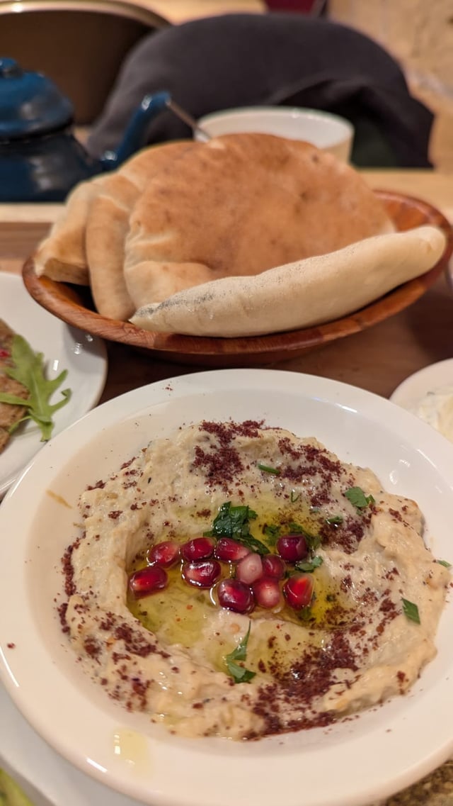 You're looking at falafel, hummus, mutabal, ful medames, pillowy soft bread, cheese, olive oil, ijeh (like an omelette or thin frittata), eggs, savoury pastries, zaatar, pickles, and there was bottomless sweet mint tea and coffee.
