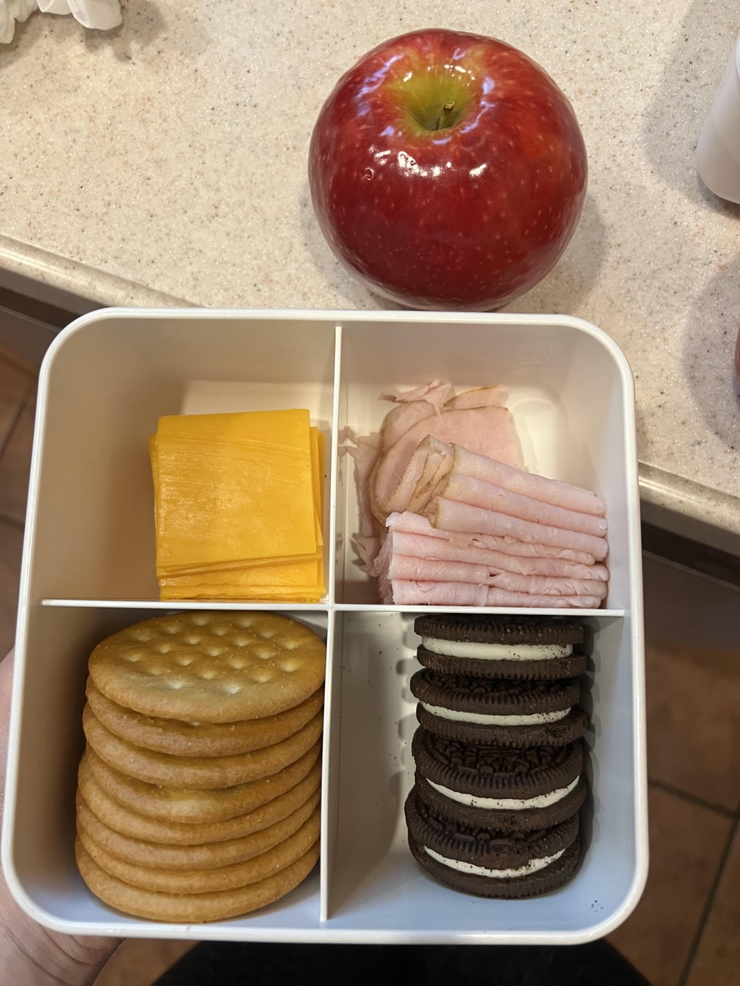 Second pic is my “homemade lunchable” with crackers, milk cheddar cheese, turkey, and oreos to replicate the exact lunchable my fiance requested haha