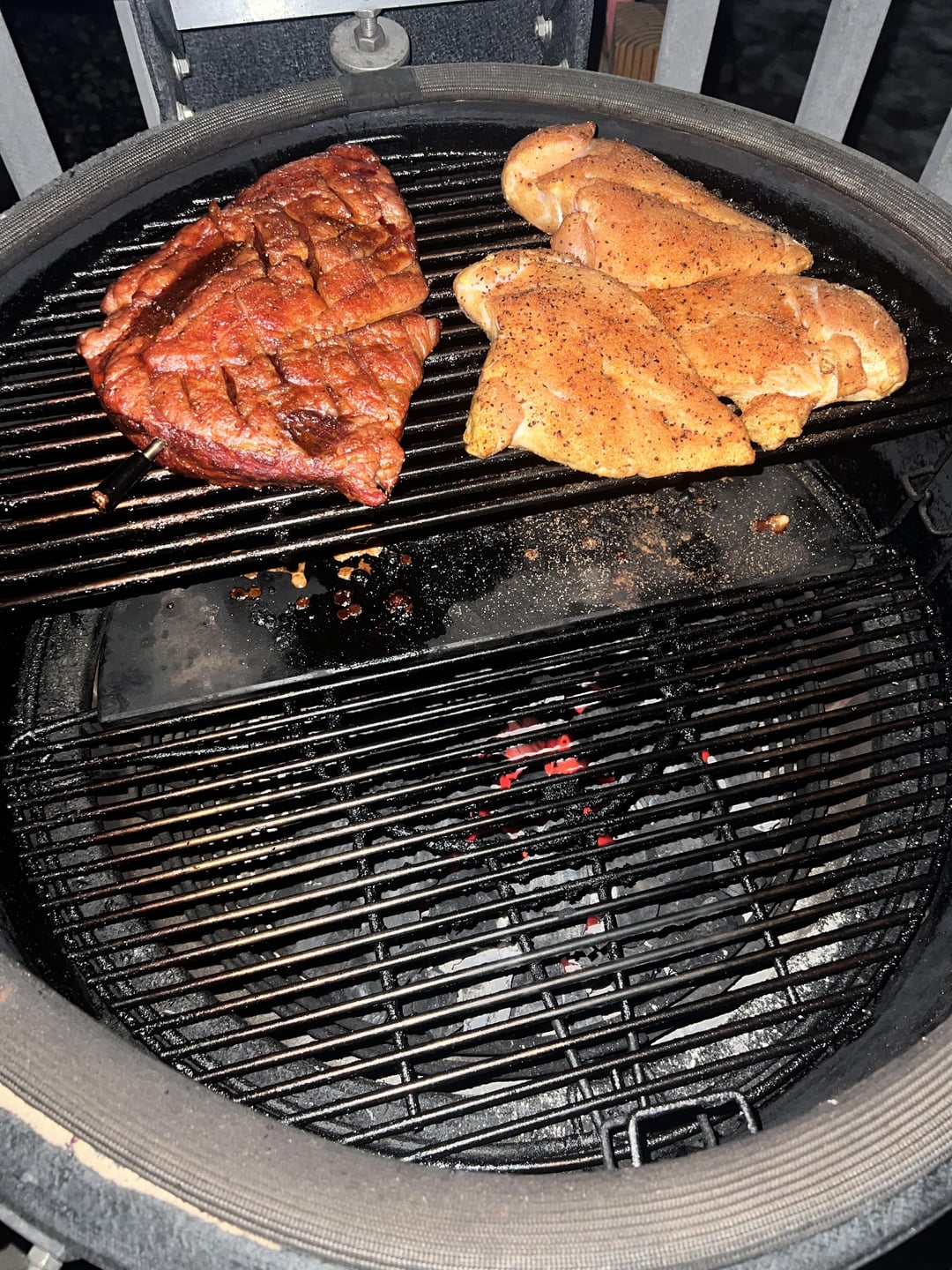Pulled out of the fridge, let it come to room temp, olive oil, and the gospel rub from meat church. Smoke til 95 opened the vents, wait until 100 to toss it on the bottom grate, flipped at 111 fat cap down and pulled it off at 124/5. Let it rest to 135 and cut this baby opened and enjoyed!!