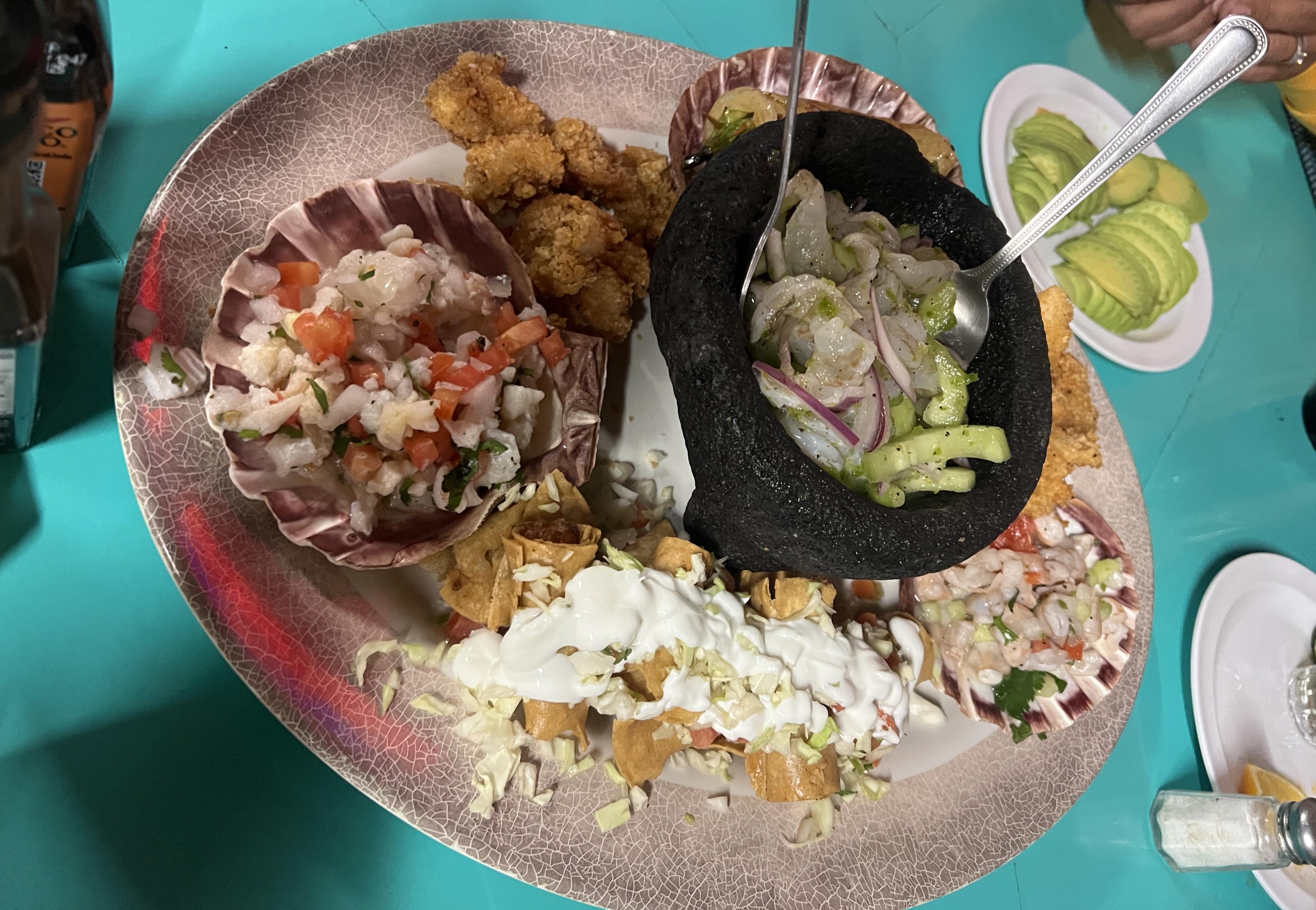 Seafood platter with ceviche pescado and Camarón and pescado frita and taquitos of pescado and Aqua chiles and frita camarón and frita pescado.