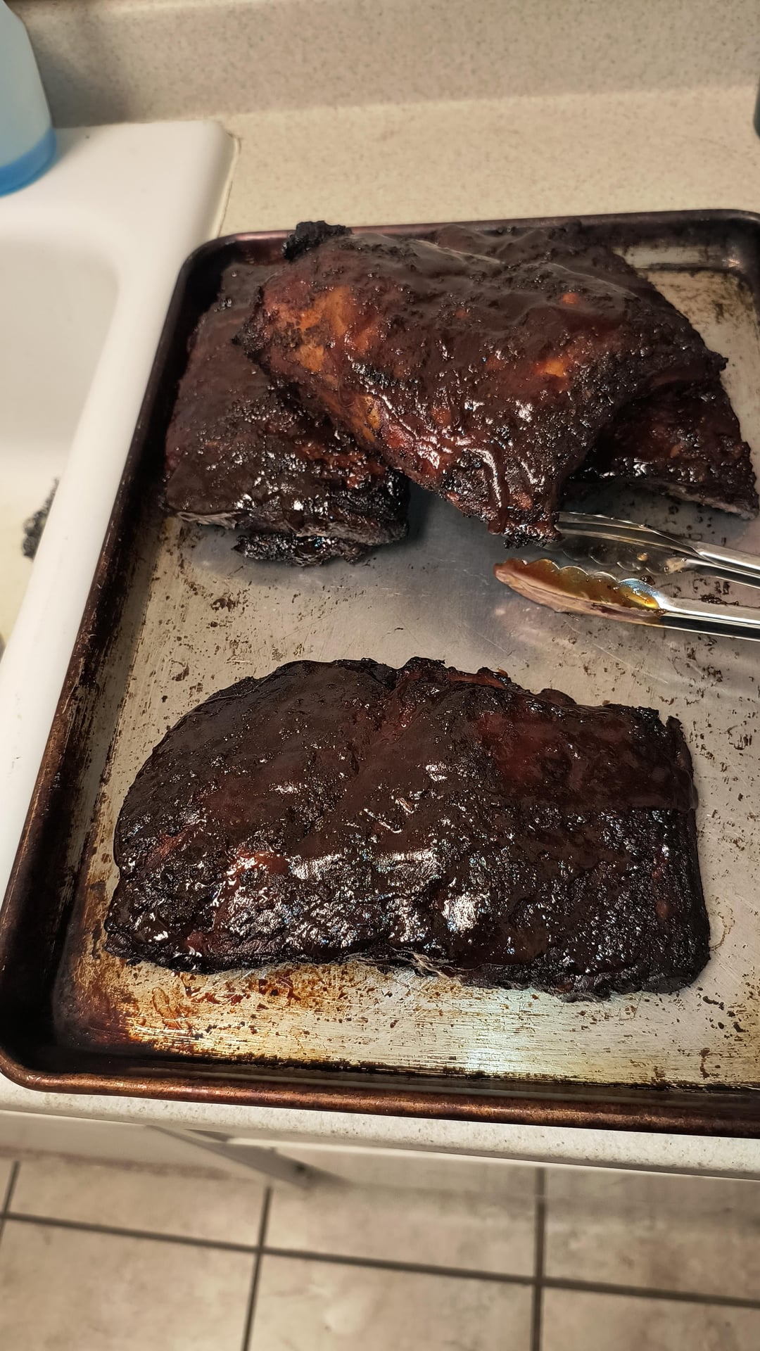 Stayed between 250 and 275 with a snake. Had to start it with rubbing alcohol, cause I forgot my chimney at my brother in law's place. Doh! Coated in Aldi BBQ sauce and rubbed with a mix of salt, black pepper, paprika, garlic powder, dark chili powder, poultry seasoning, onion powder, and tajin. Let it sit overnight. Squirted with apple juice every so often, and finished with more BBQ sauce. Two racks, cut in half.