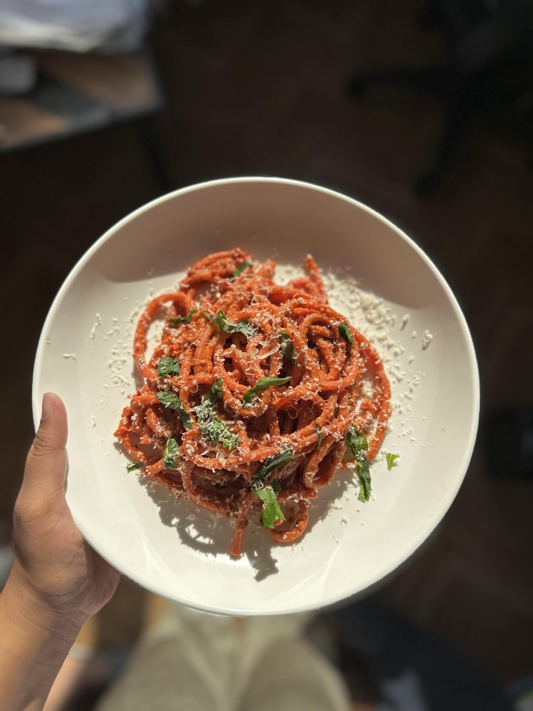 I sautéed Thai red chili (optional), garlic, and onion, then added the purée along with a bit of pasta water and fresh basil. I let it simmer for a while to allow all the flavors to meld.