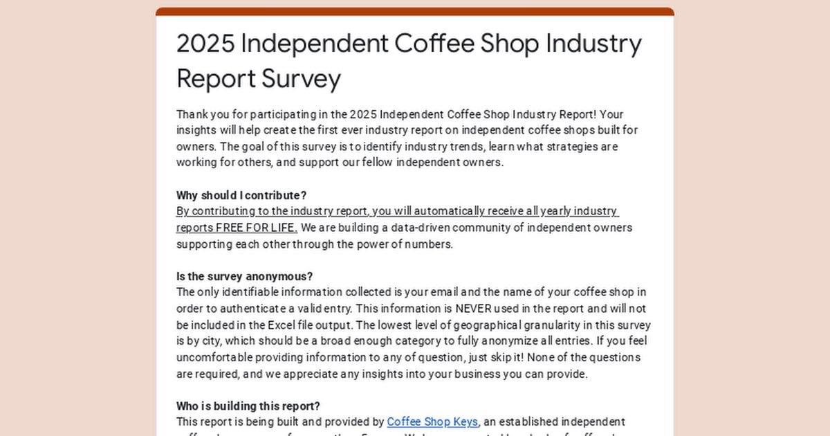 Hey coffee shop owners! Coffee Shop Keys is putting together the very first Independent Coffee Shop Industry Report to help independent owners understand trends, pricing, and challenges in the industry. The 100% anonymous survey takes just 5-10 minutes, and everyone who completes it will get free lifetime access to every yearly report with real insights from real coffee shop owners. Your input will help create a valuable resource for the community! The survey is open until March 15th and final reports will hit your inbox by June 1st.