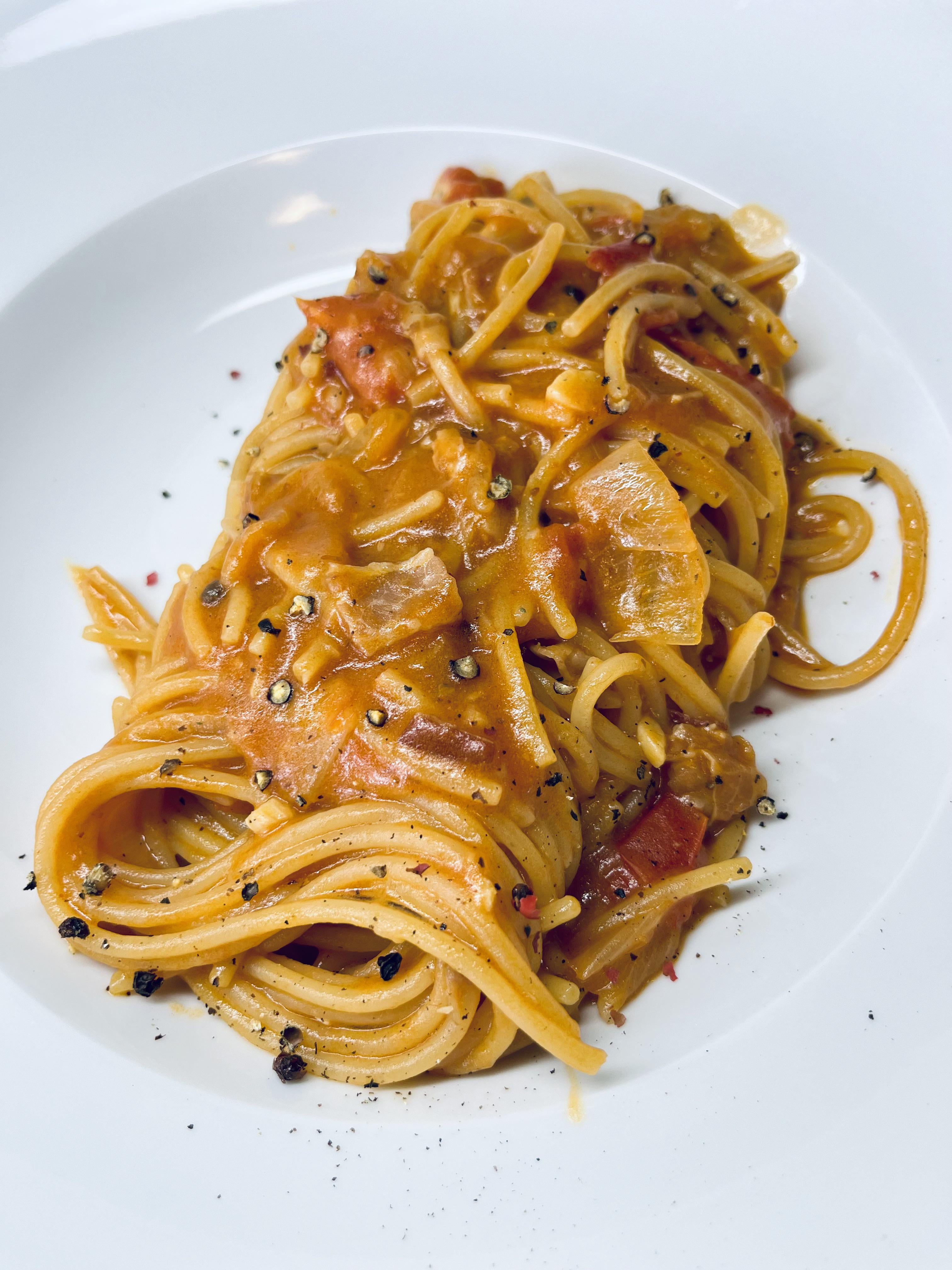 Pot, olive oil, roughly sliced onion/onions, sliced garlic and cubed/sliced pancetta, moderate heat, sauté without color, when the onions soften up add the tomato paste, cook the pasta in a separate pot in salted water, when the pasta is al dente, add to the sauce, add the additional fresh tomato chunks if you have them, sprinkle with grated grana padano. If too dry add a bit of pasta cooking water. Adjust for salt, black pepper and olive oil.
