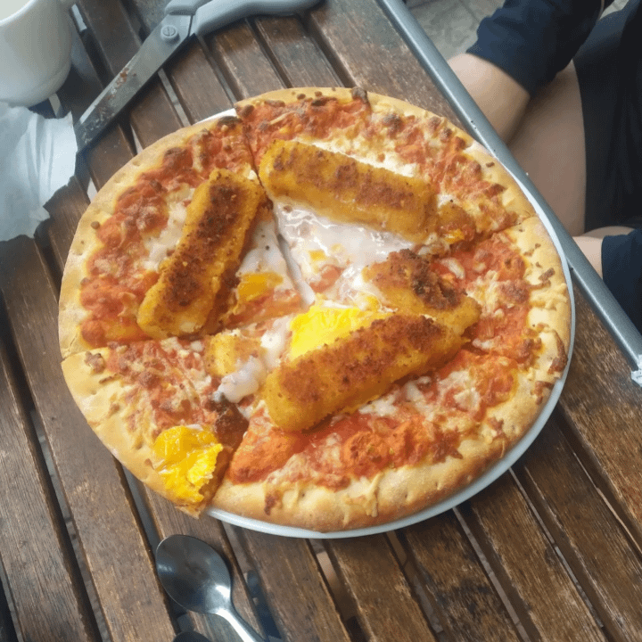 Egg and fish fingers on pizza? This crime was definately commited in England.