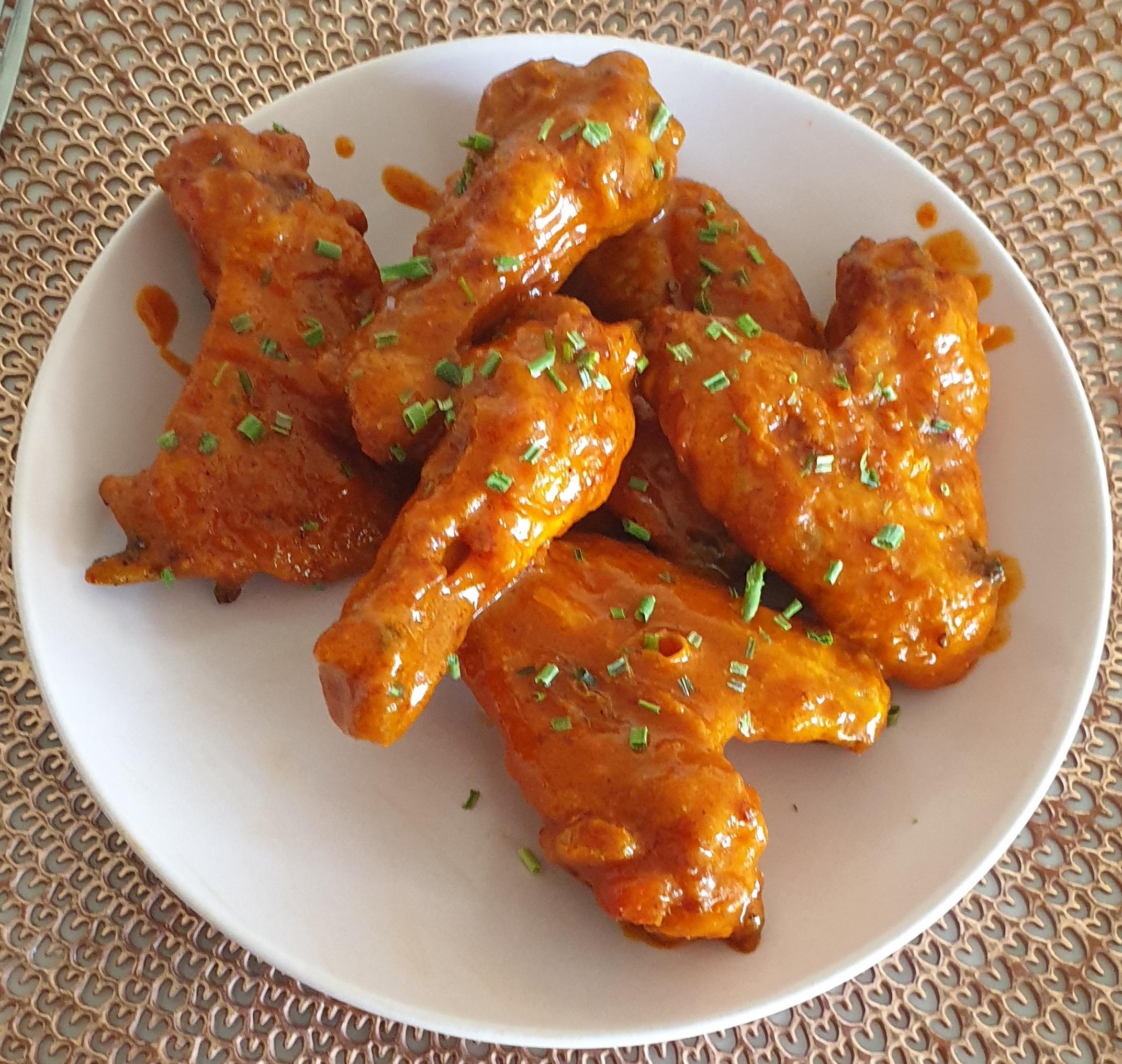 **Buffalo Sauce:** – 1 part butter – 1/2 part ghost pepper mango hotsauce – 1/2 part sriracha extra hot – a little honey – a little mayo – a little herbal vinegar – a small splash of worcestershire or bbq sauce – spices (smoked paprika, black pepper, garlic powder, lots of cayenne pepper and a tiny bit of soy sauce) – gently add flour dissolved in water to get the sauce to your desired thickness – sprinkle coated wings with fresh chives
