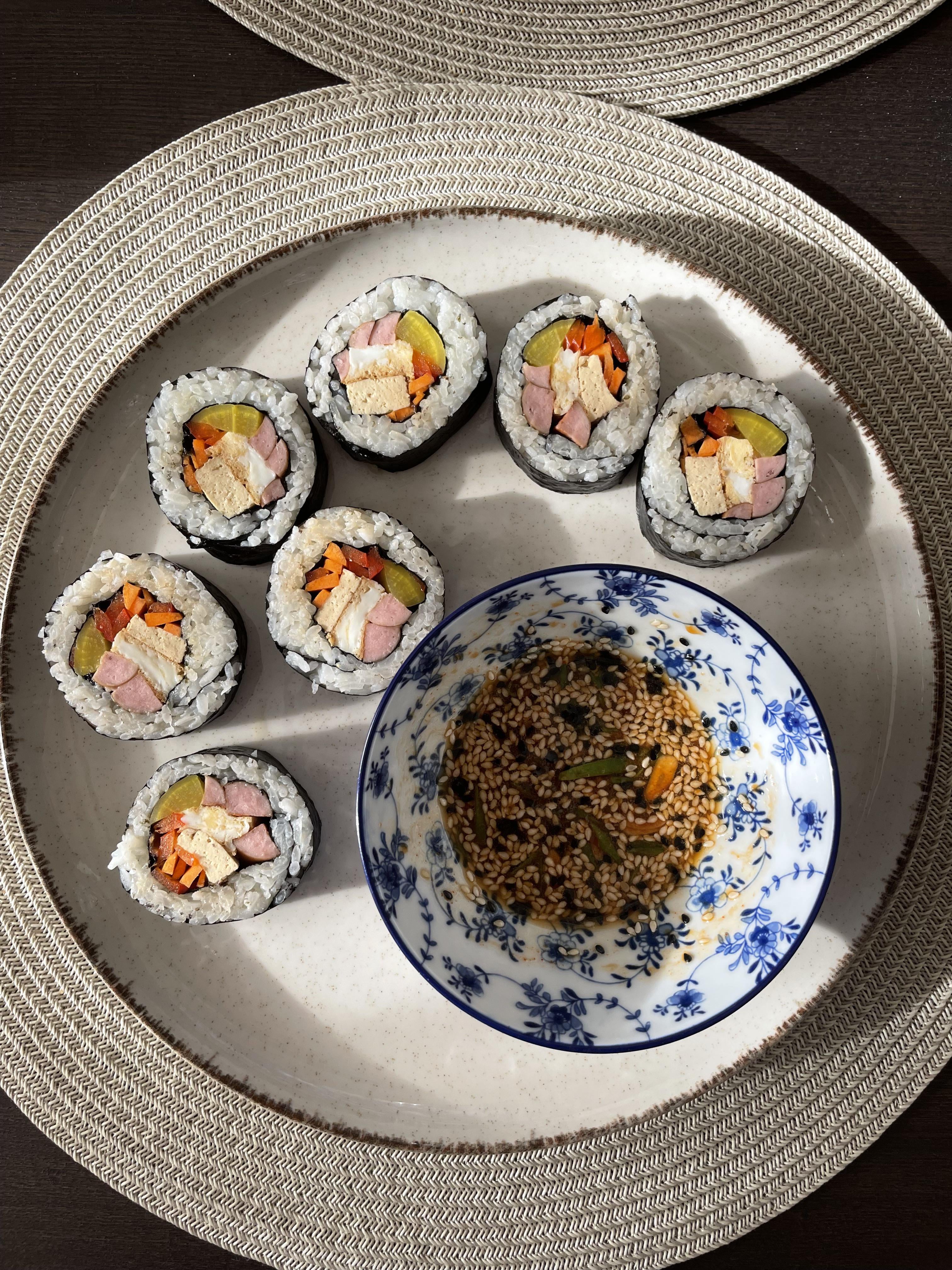 Made some kimbap. This is my third try. I’ve seen this cool technique of wrapping one sheet of seaweed around the filling and then another around the rice. It made wrapping the kimbap much easier and gives nice contrast and good crunch.