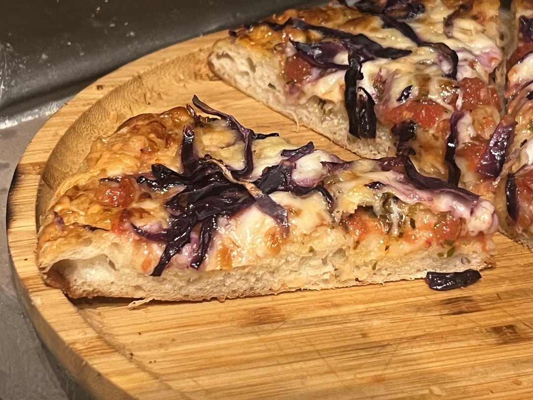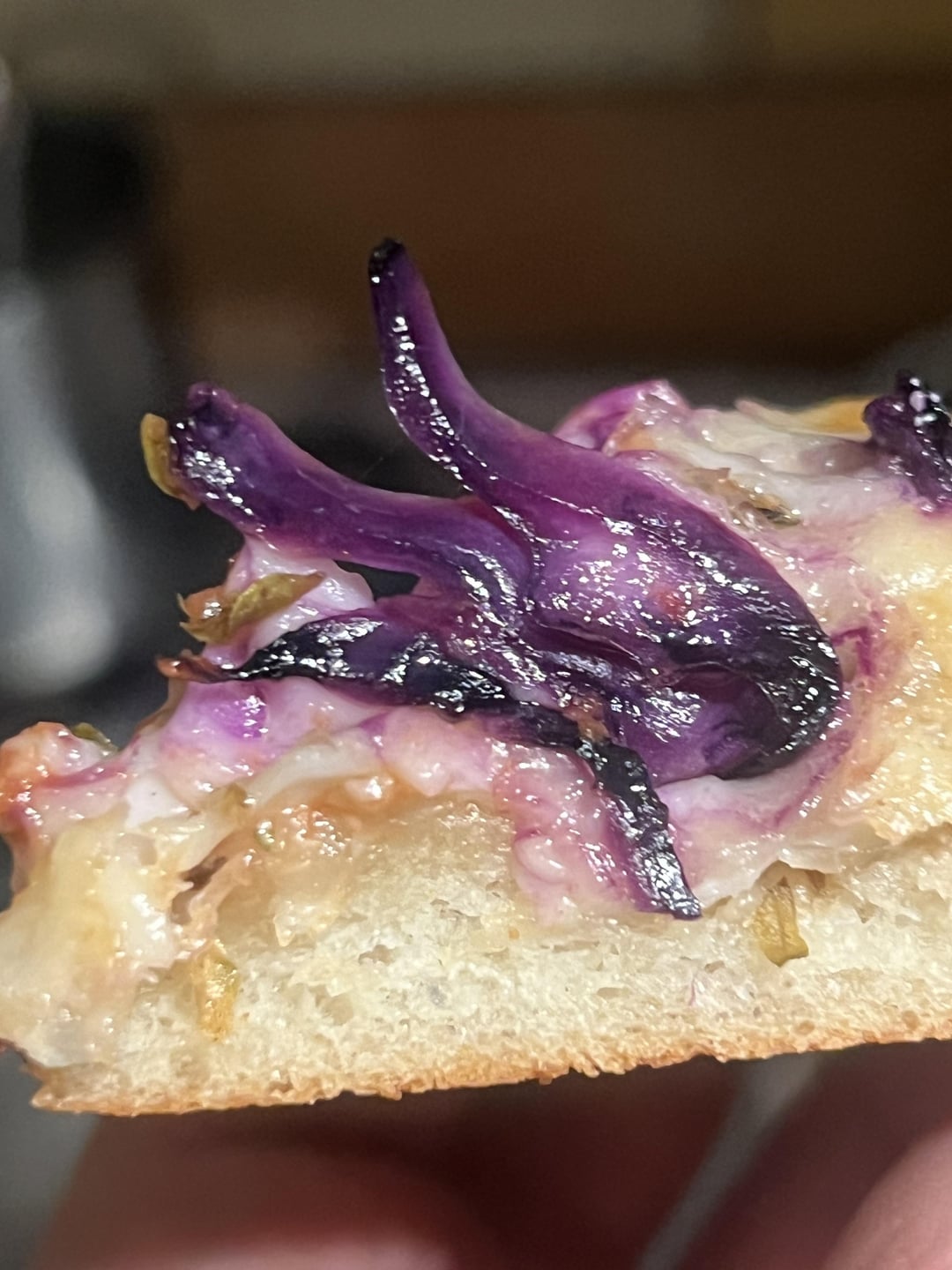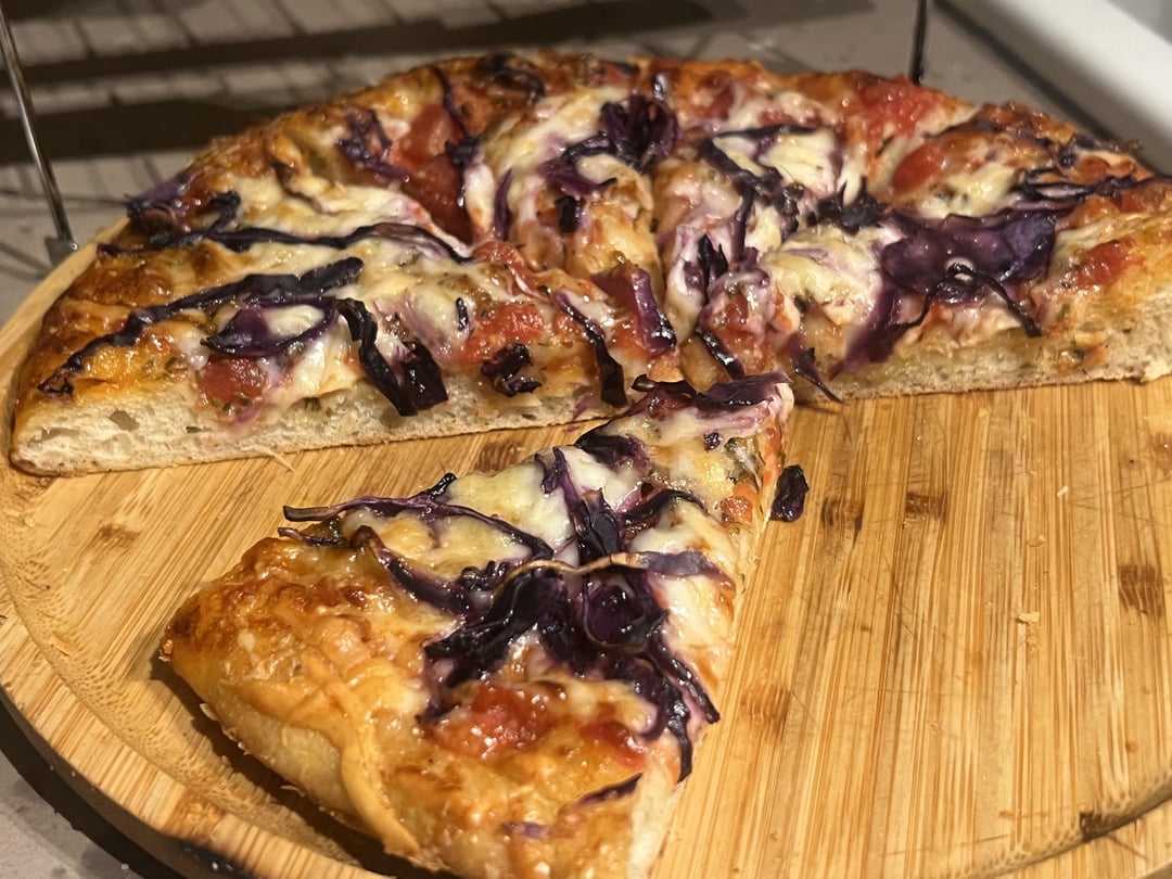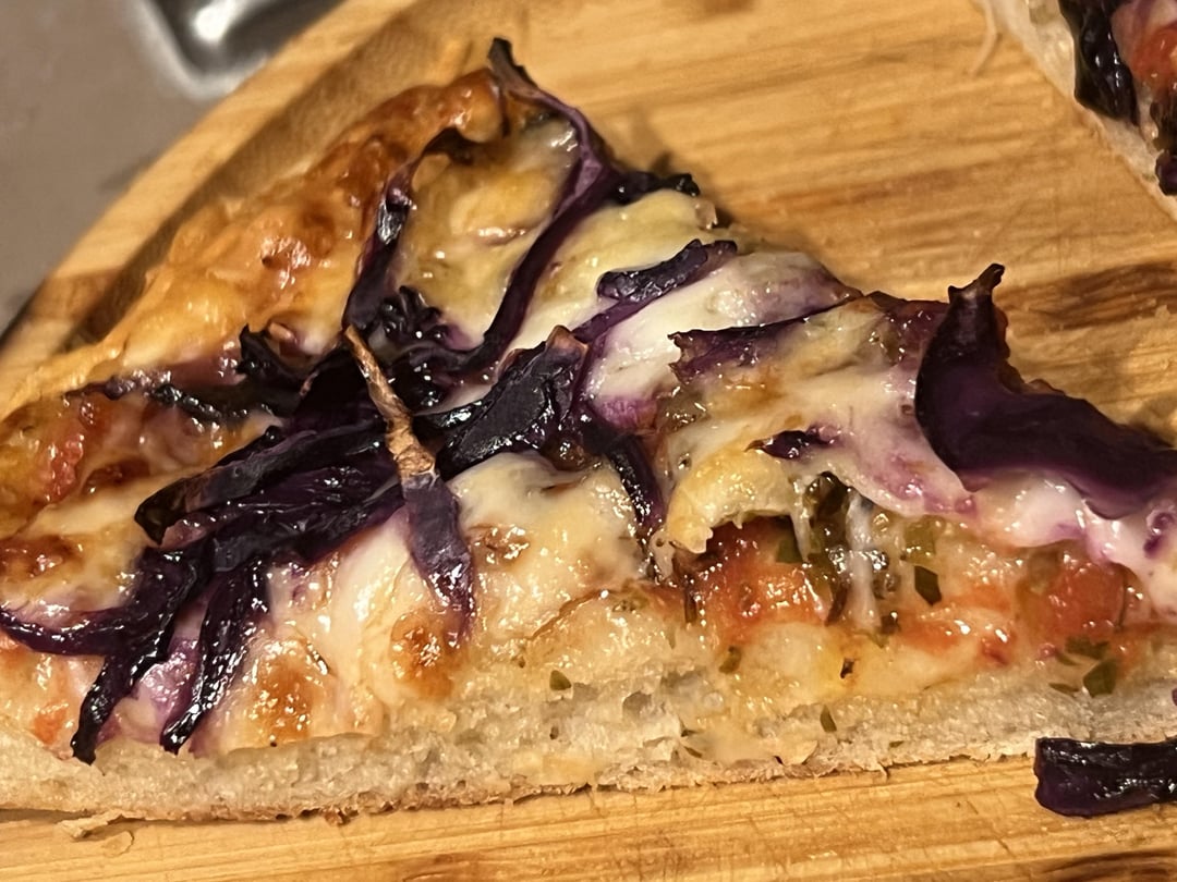 At first I thought it was the skin of a red onion which would be a crime because that is not the edible part, but cabbage is good. Prolly needs to be cooked separately before baking it on the pizza, which most ingredients don’t really need. 9/10 not a crime