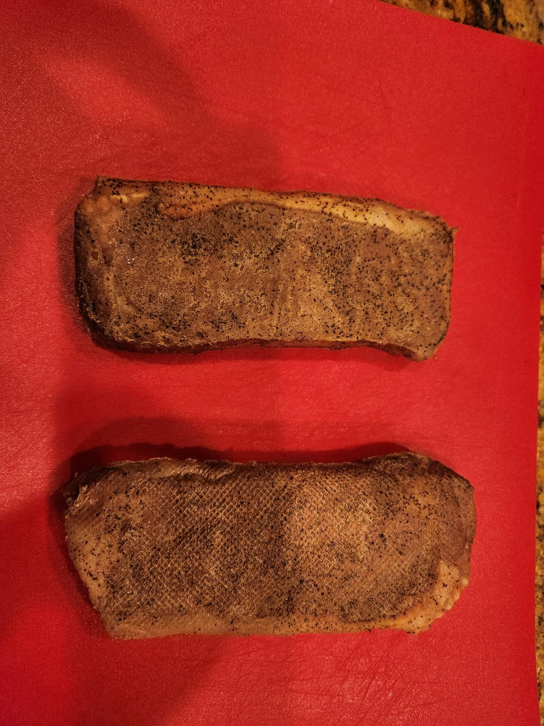 Color is darker due to longer dry brine I assume.