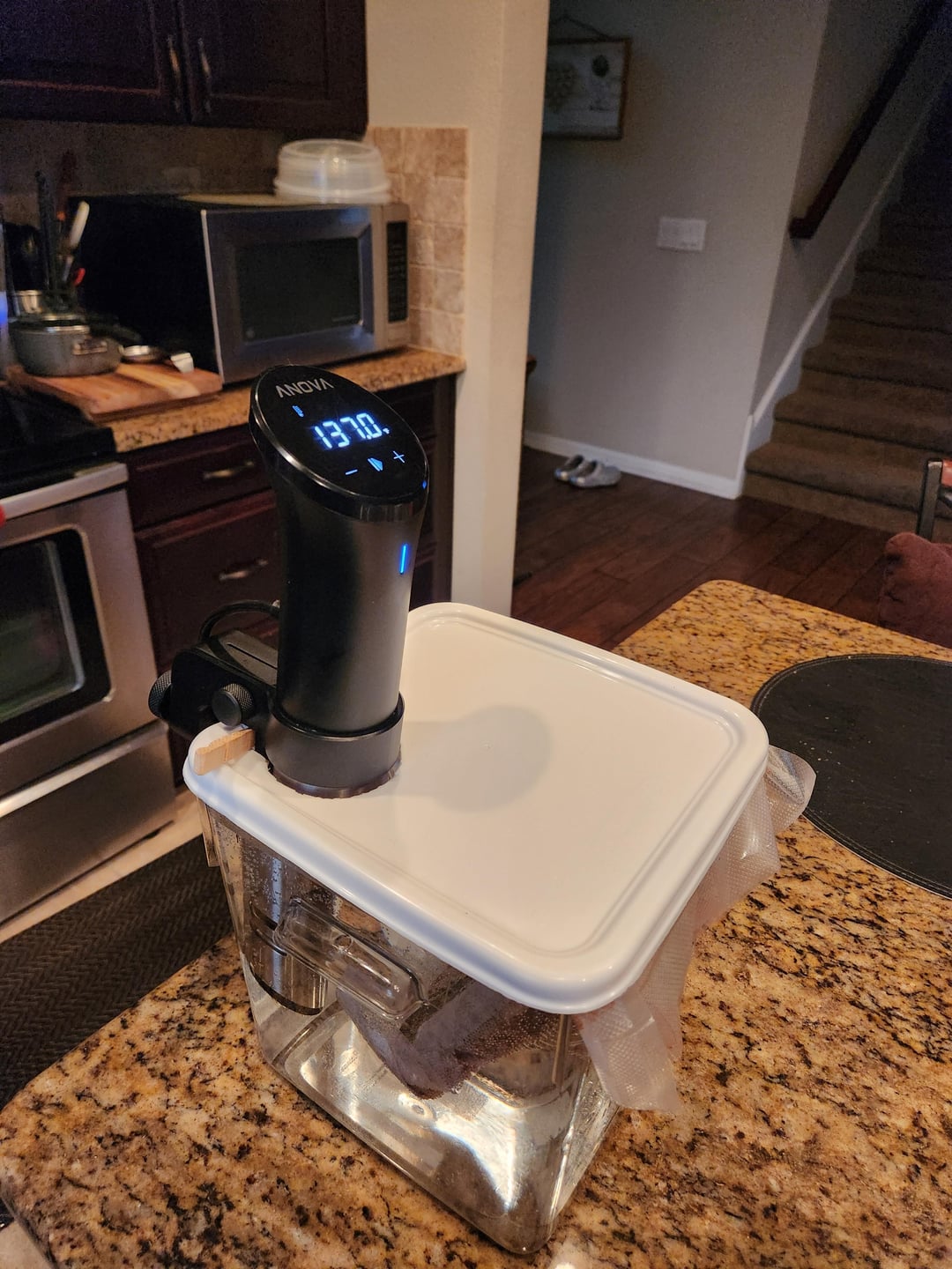 The clothes pin is to keep the circulator from touching side of container. My custom (bootleg) setup.