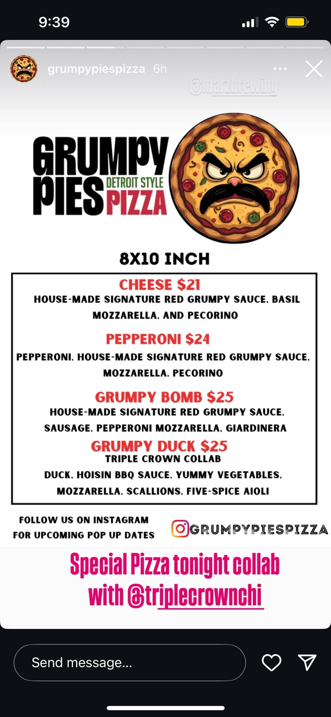 They rotate their current “special” pizza, but Grumpy Pies does regular pop ups at Marz. Would definitely recommend!