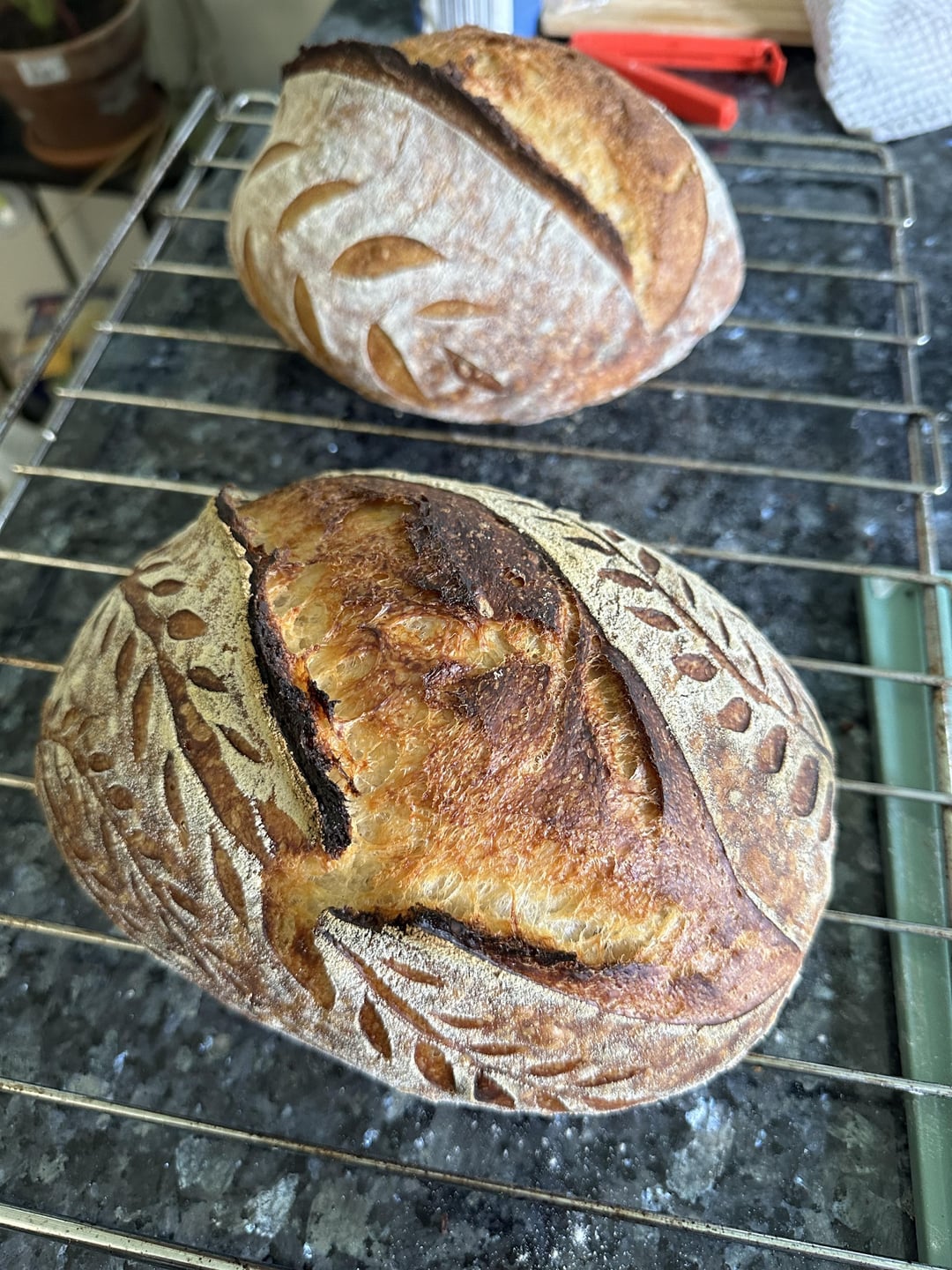 I use Josh Weismann’s recipe (mostly 😅), but recently I’ve been having trouble shaping, for some reason my dough just has no structure – my guess is overfermentation (I started breading in winter, it’s summer now and so much hotter) so following some advice on this sub I went and bought a straight sided container and measured the % rise based on the dough temp – to much success! This loaf is the nicest I’ve done in a little while, and the tiny wheat scores elevate it to next level pretty!