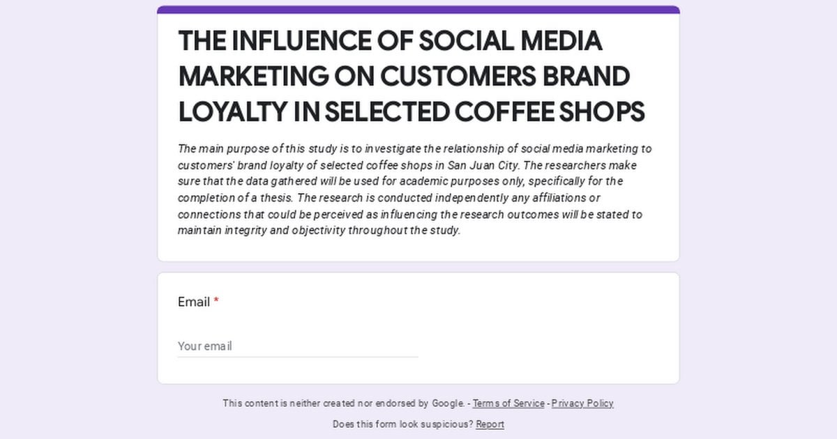 Hello everyone! I am an Hospitality student from PUP San Juan and I need your help with our research about influence of social media marketing on customers brand loyalty in selected coffee shops. I notice that many of you here goes to coffee shops. I hope you can spare a few minutes to answer this survey. I am also conducting a raffle for people who will answer this survey. Get a chance to win PHP100, all you have to do is comment a screenshot that you have completed the survey and you will be automatically entered in the raffle. We need at least 400 participants for our survey and we still have a long way to go.