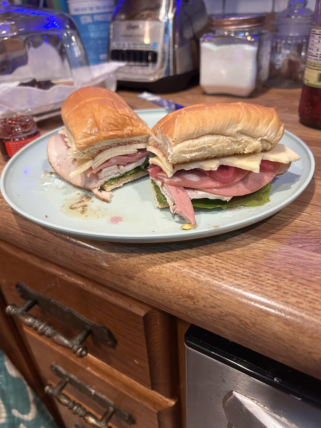 foodsave 9 months ago Morton’s hoagie roll pan toasted in butter, dukes mayo, romaine, deli sliced roasted turkey, mortadella, Italian salad dressing, pickled red onion, havarti and a smear of tart cherry jam.