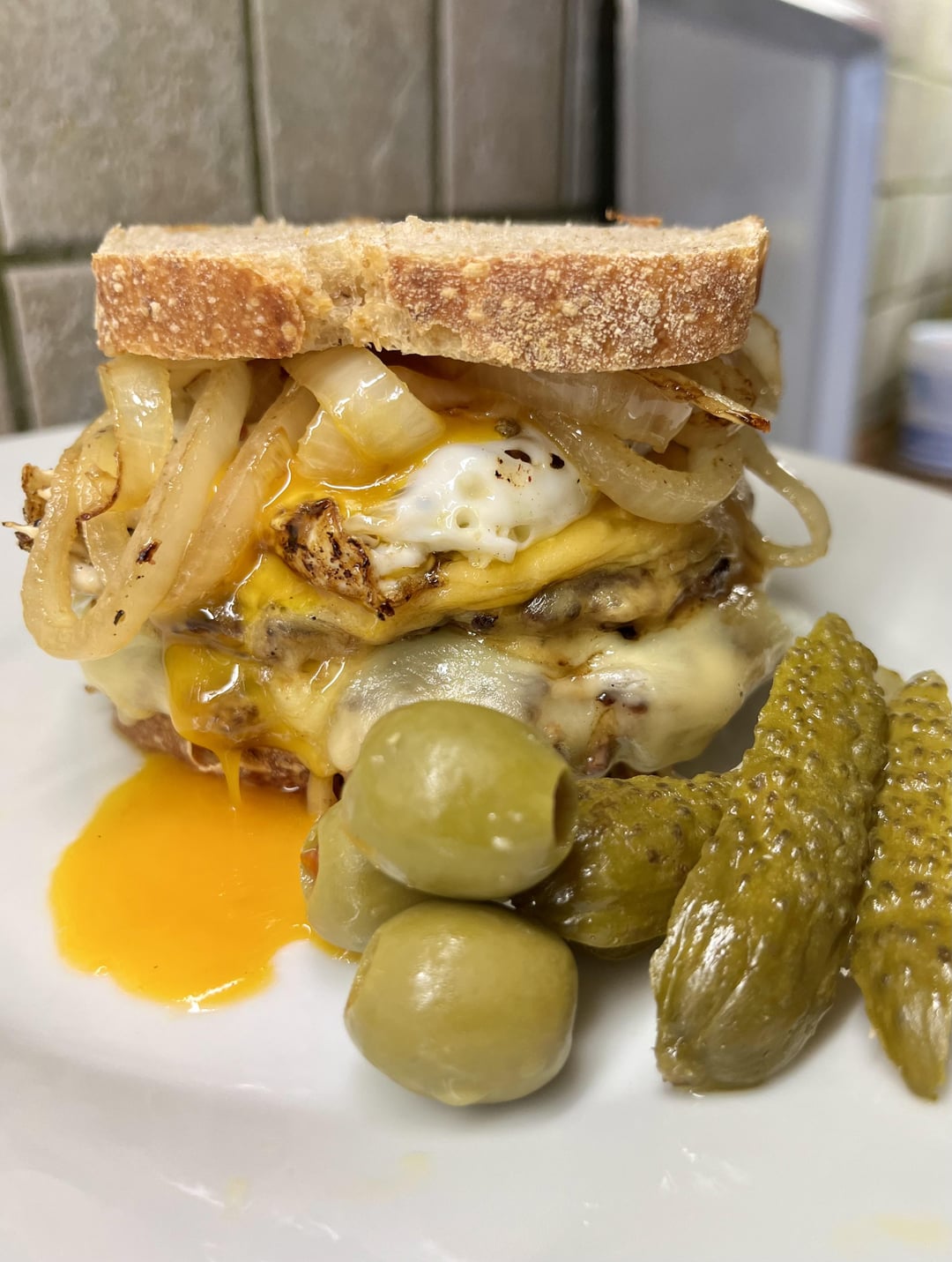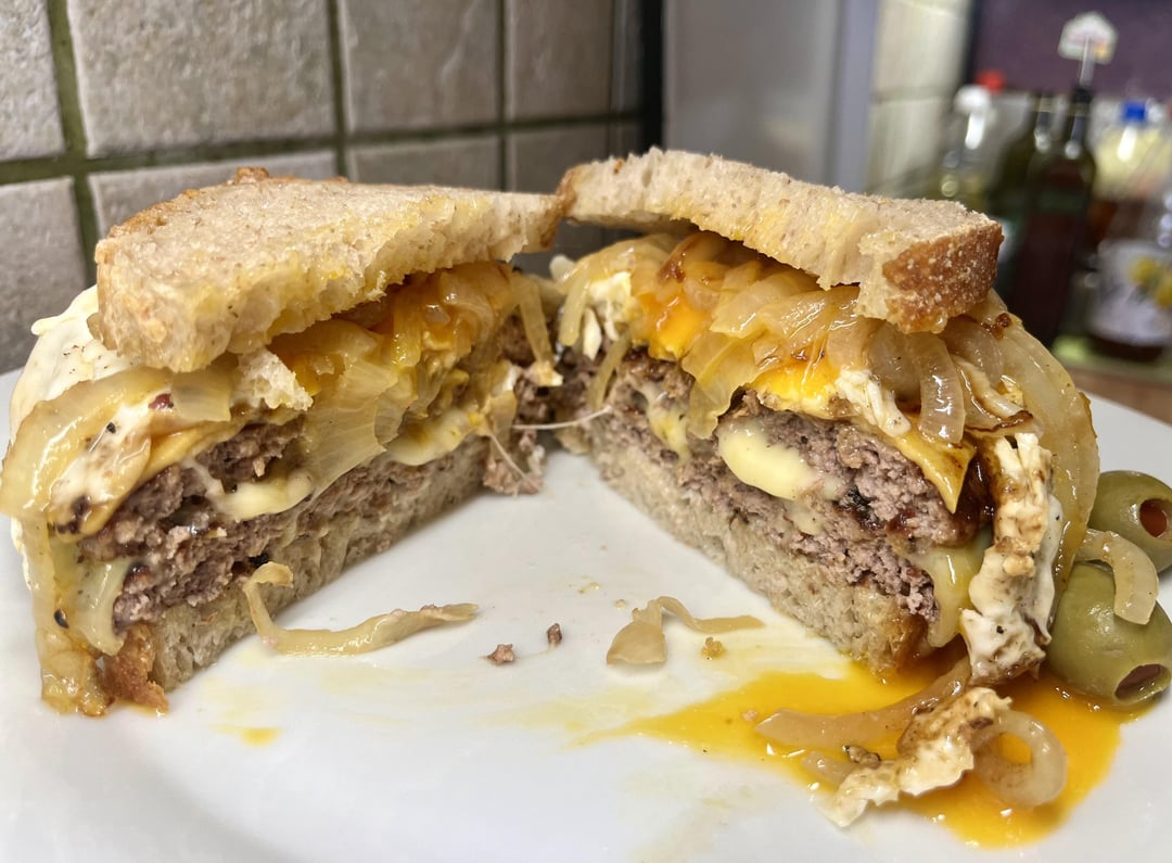 • two pan roasted beef quarterpounders, pan roasted in olive oil