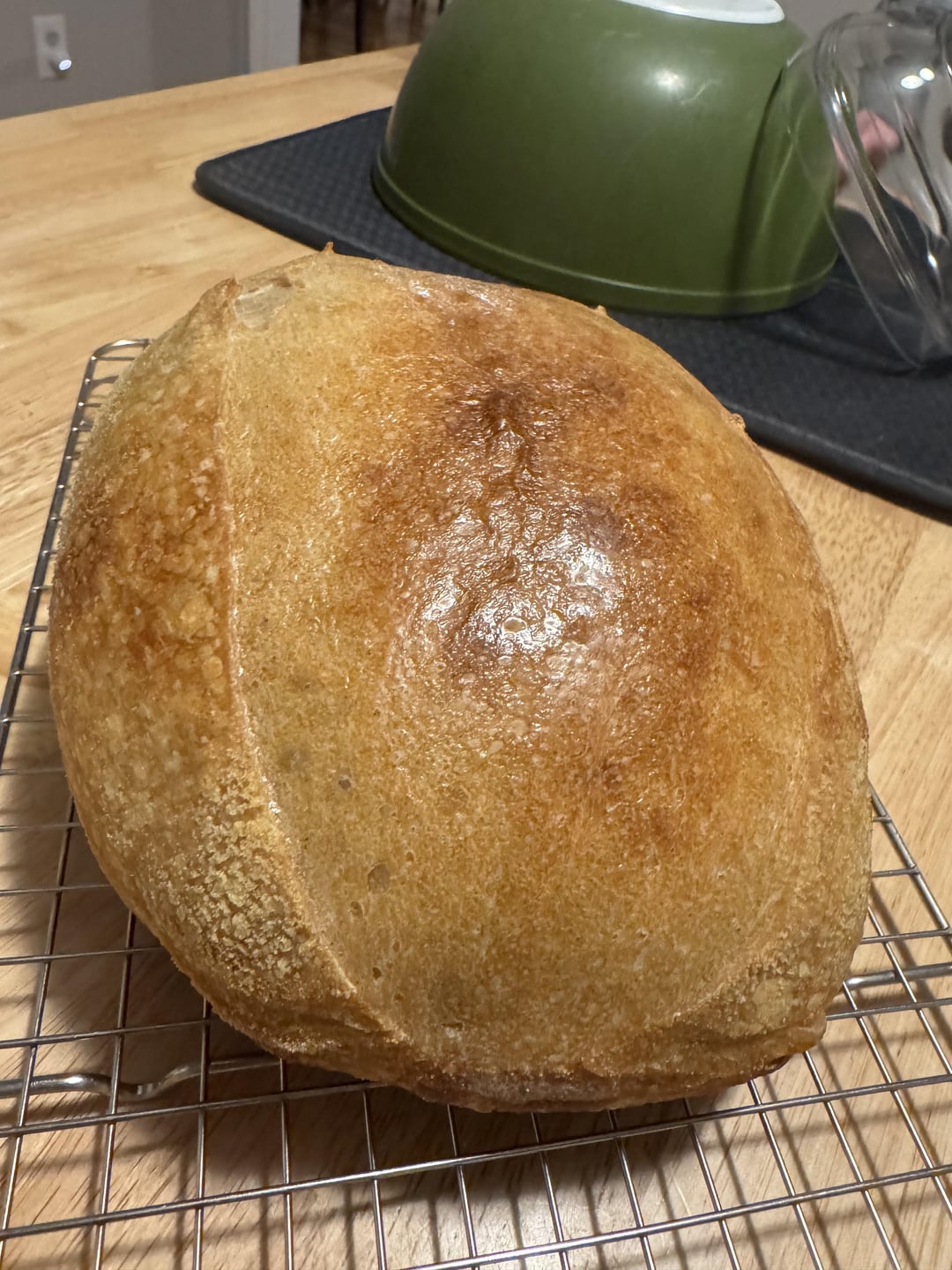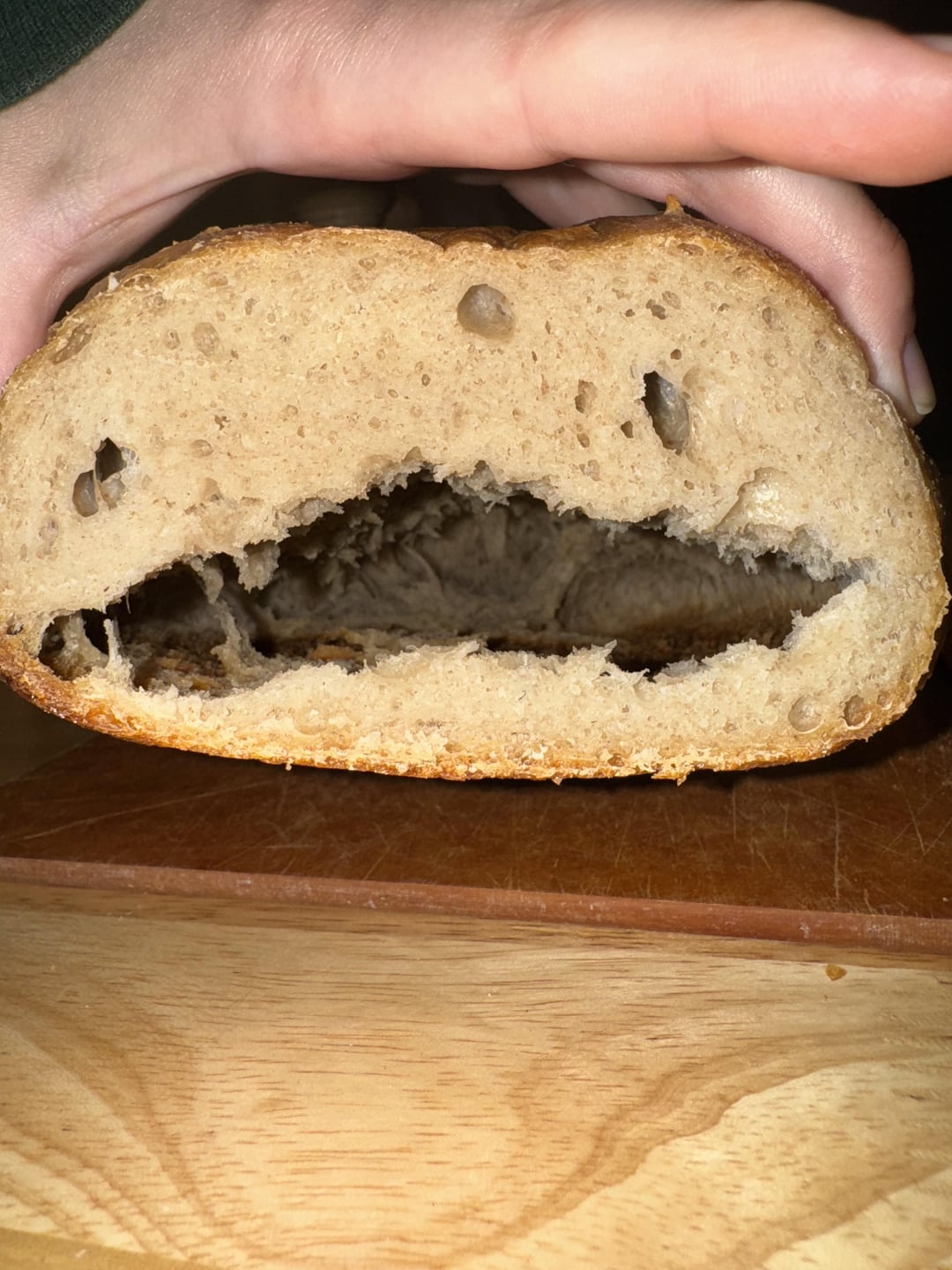 Been baking slightly subpar sourdough loaves for years, decided to switch things up and tried out the King Arthur’s Pain de Campagne recipe. Turned out weirdly shiny with the bottom third completely hollow from end to end. What the hell happened and how can I put it out of its misery?