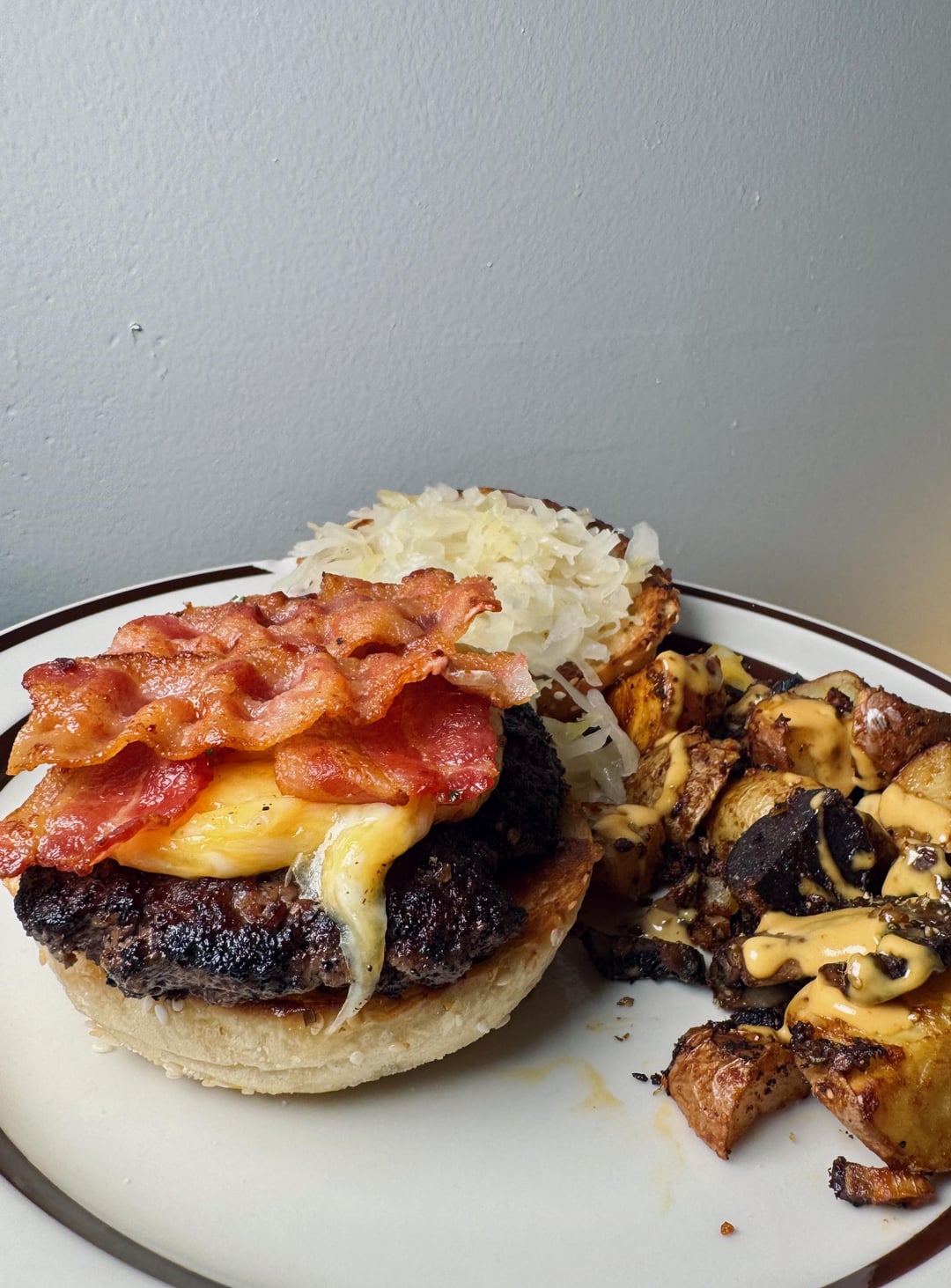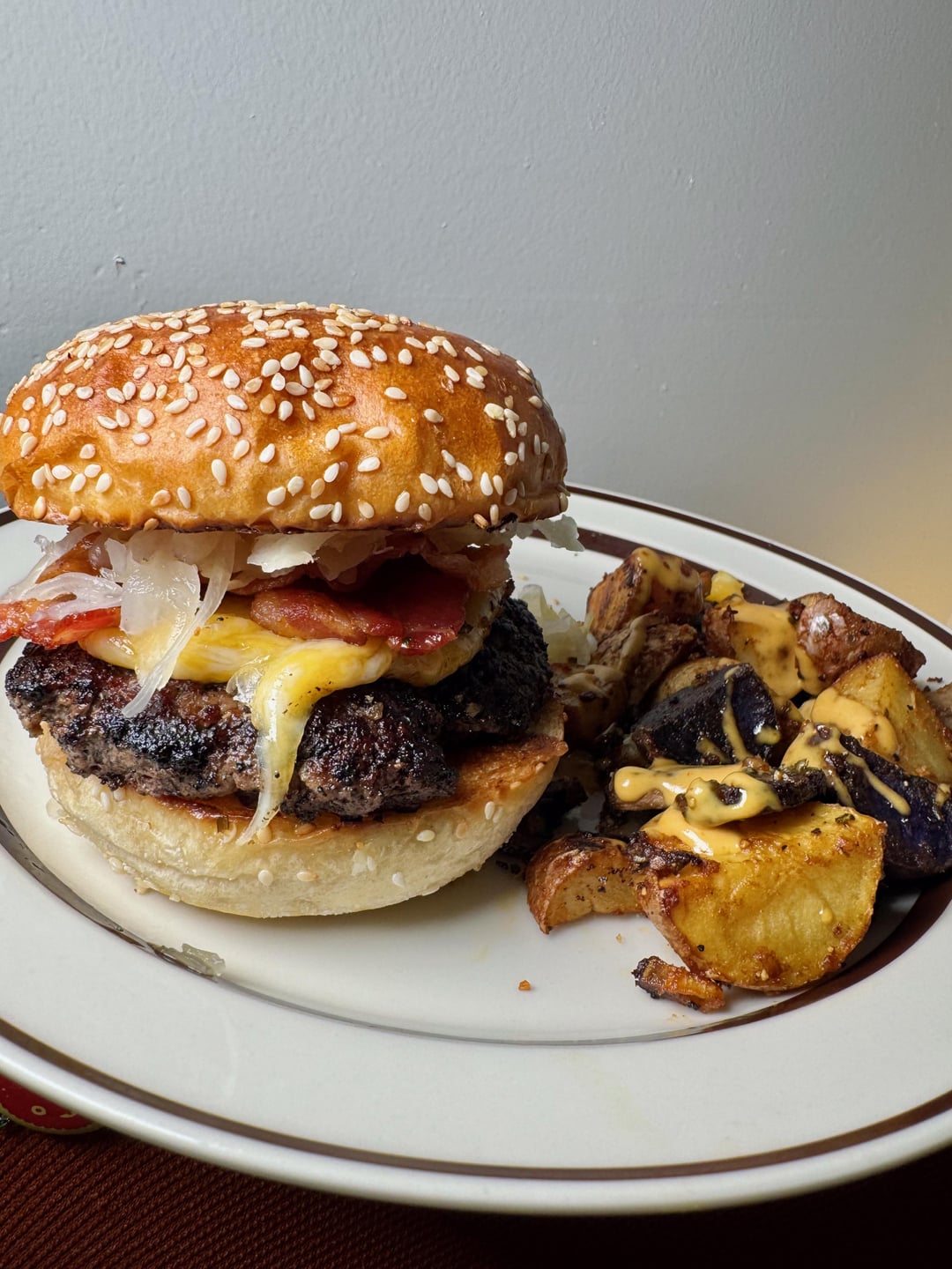 One of my better efforts.by daversa 5 Comments daversa 1 year ago * Homemade sesame seed buns * 321 sauce (mayo, mustard, Worcestershire) * [Ted’s style steamed cheese](https://youtu.be/i8YouisYQtE?t=21) * Bacon * Kraut * Sheet pan rosemary garlic potatoes and mushrooms.I’ve tried doing steamed patties before and they’re kinda “meh”, but the cheese is where it’s at. Used_Priority1028 1 year ago Looks great! TheSpudstance 1 year ago Never done kraut on a burger but I already know I’ve been missing out all my life AdSad5448 1 year ago Looks to me like you have a restaurant style plate too! AttemptFree 1 year ago no complaints from me op, except an invitation to dinner would’ve been appreciative! looking great!Write A CommentYou must be logged in to post a comment.