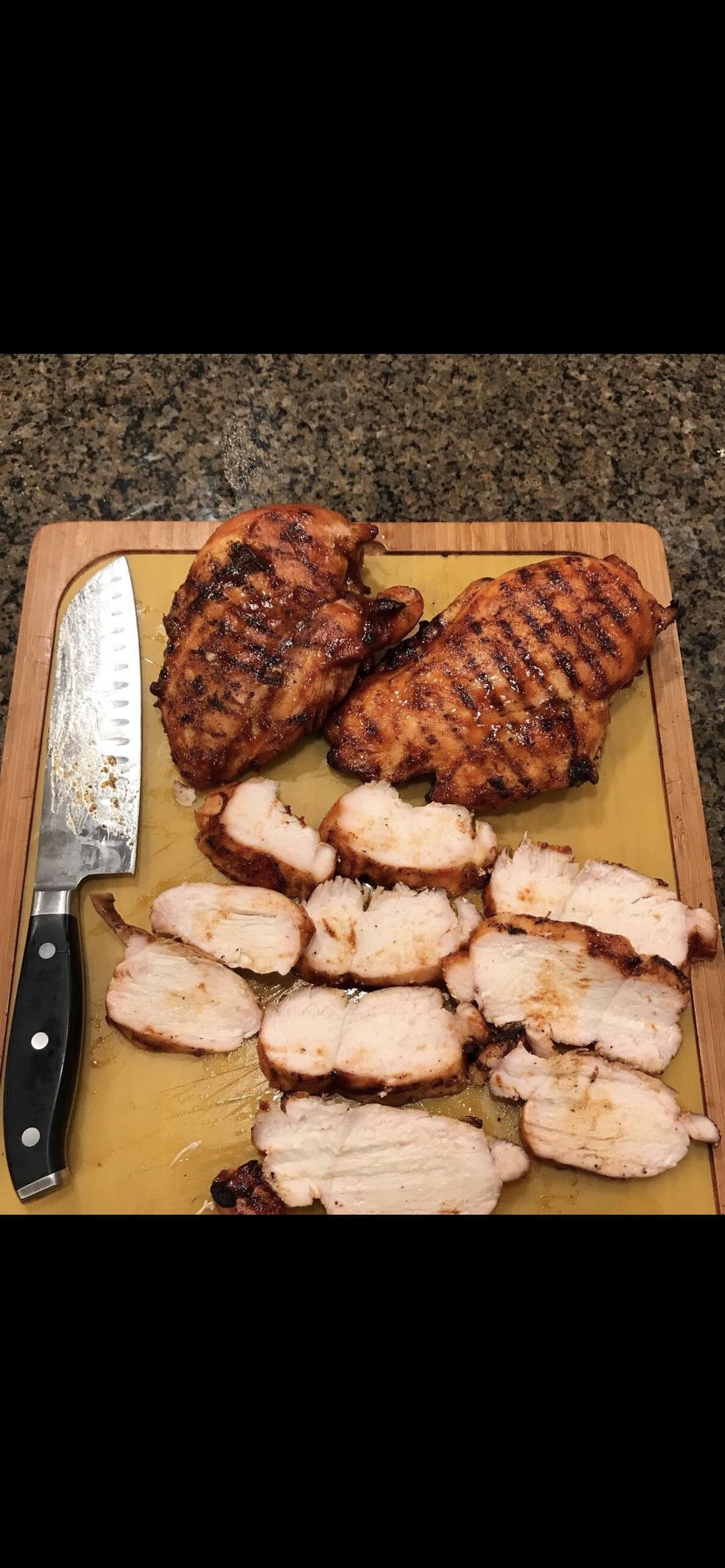 Chicken breast simply brined for an hour and cooked at 450f and glazed with wood ranch bbq sauce on the Traeger till internal temp reached 160 then pulled wrapped in foil and carry-over cooked to 167f