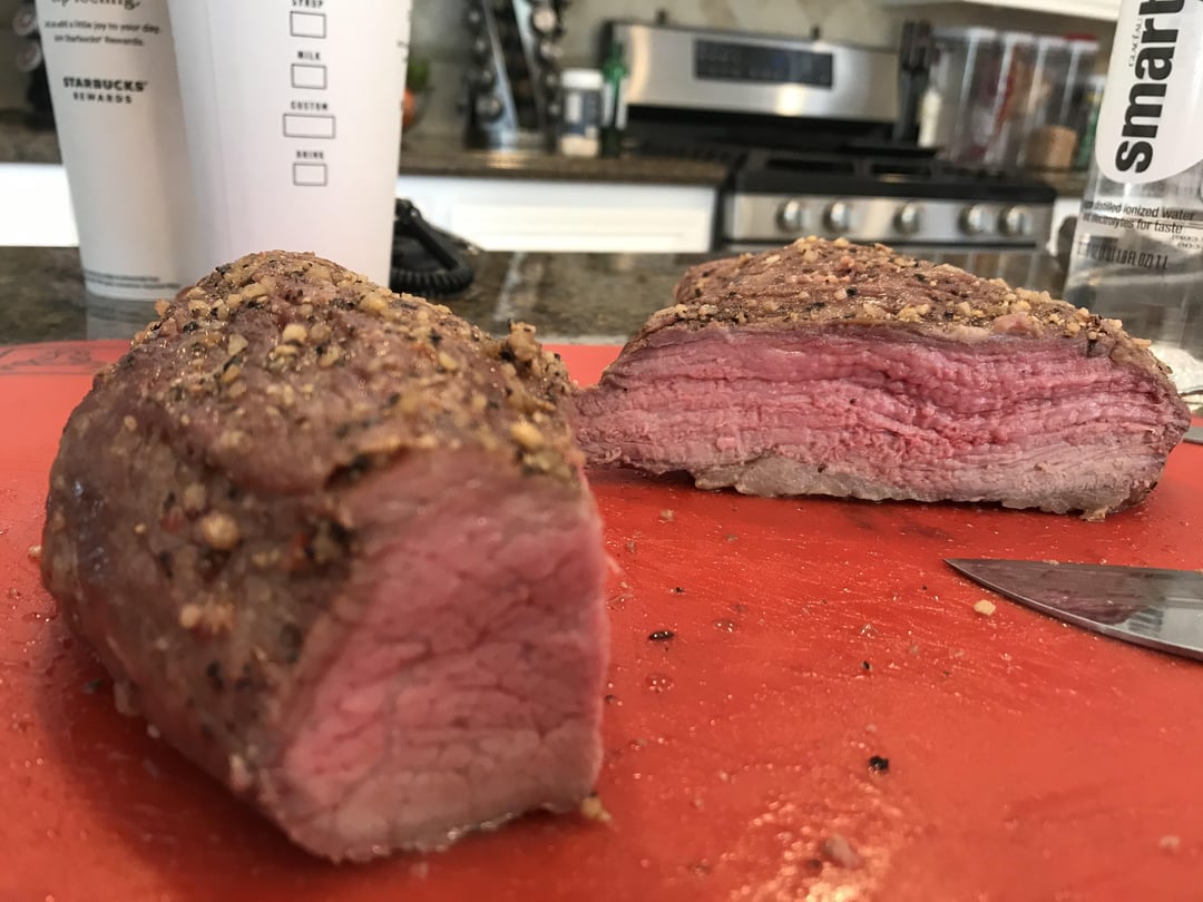 Trip tip roast /montreal steak seasoning smoked at 275f on the Traeger until internal temp reached 130f pulled and rested.