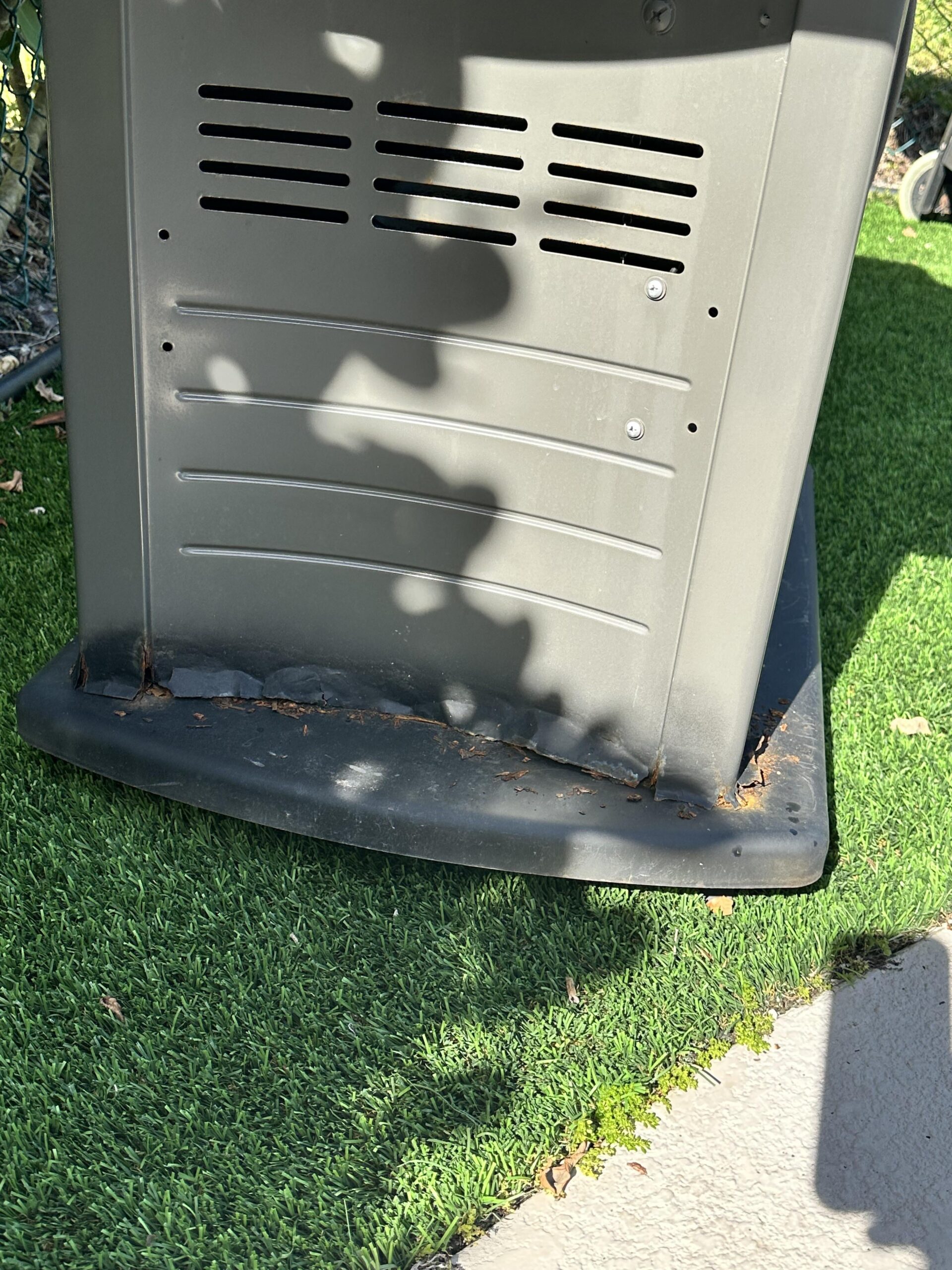 Looks more like water could be pooling on the flat shelf that holds the castor wheels. I don’t have this grill (kettle for me), so I don’t know if there is a drain hole inside where the tank goes. Even if there was, it seems like a design flaw. If the grill wasn’t perfectly level, water could pool on that shelf around the base where you are seeing corrosion. Even with a cover, high humidity and large temp drops overnight could cause moisture to build under the cover. All of the above is speculation. Send Pic to Weber and test out their customer service.