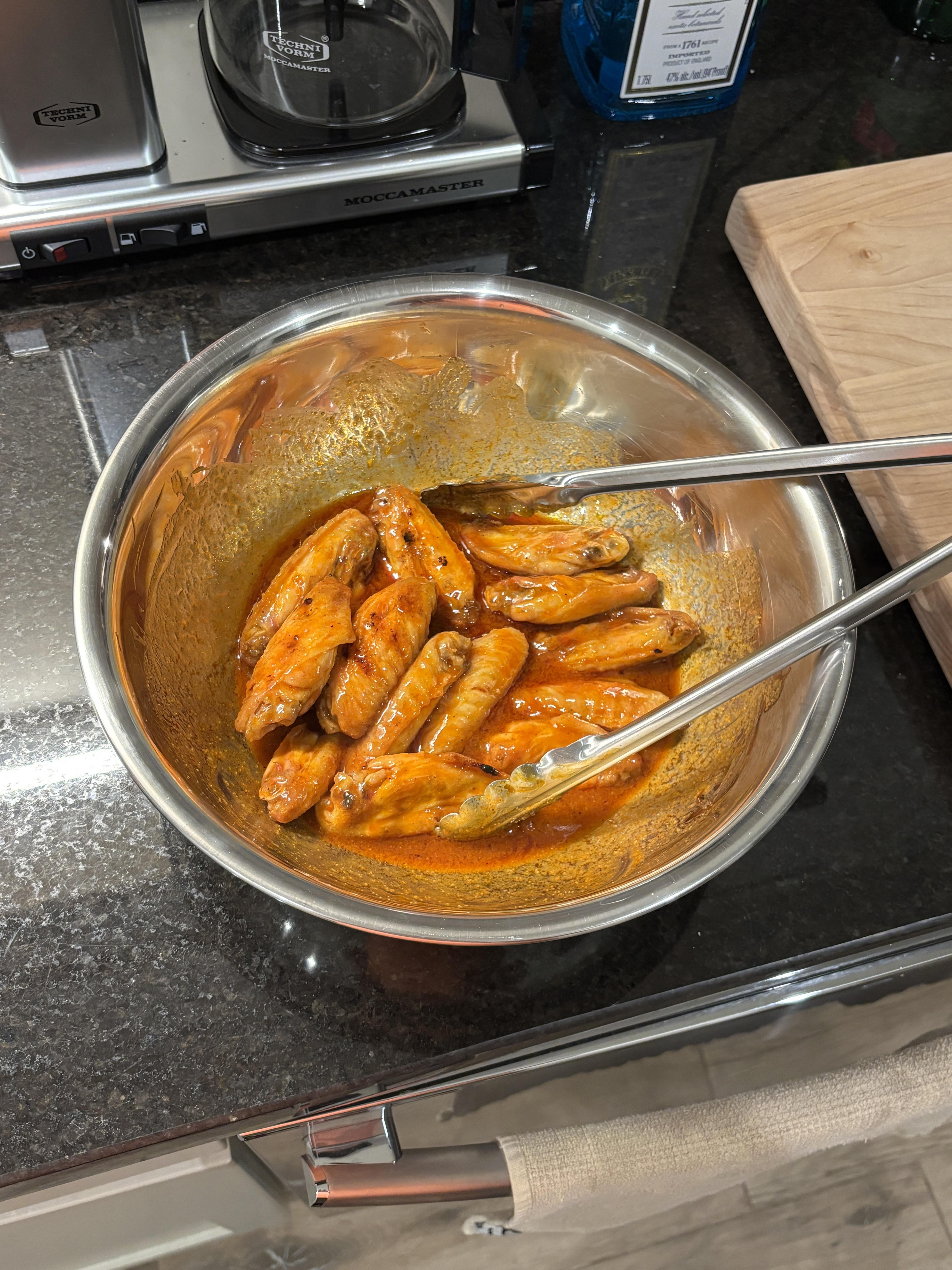 Hello fellow Moccamaster enthusiast! When grilling wings on my Weber Kettle, I’ve found high heat is a good thing. I typically toss mine in a little vegetable oil before putting them on the grill. They do get a little char but “it’s flavor” as they say.