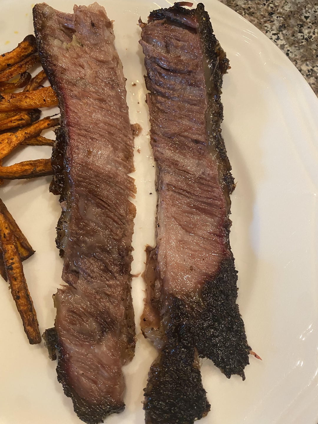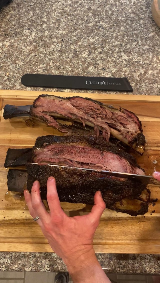 First attempt at wagyu dino ribs. Smoked low and slow at 225° on my Recteq Bullseye using Bear Mountain BBQ Red White & BBQ pellets overnight. Basted with rendered tallow once they hit 180° internal, wrapped with some more tallow once they were probe tender (about 195°), 11hr total cook. Rested 4hrs in a cooler then at 170° in the oven for 2 hours before slicing. What do you think?