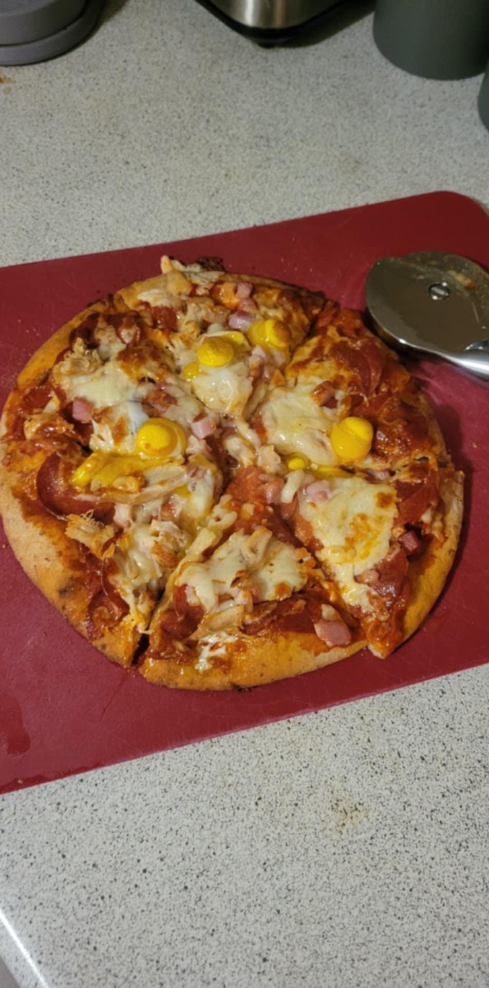 My partner made a pizza with: mozzarella, pepperoni, ham and… Quail eggs…