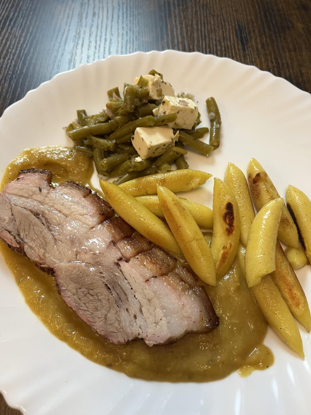 Slow-roasted pork belly, seasoned with caraway and spices, grilled on a bed of vegetables in my Kamado Joe. The result? A perfectly crispy crust, tender meat, and an insanely flavorful sauce made from the drippings. Served with homemade Schupfnudeln and a fresh bean salad.
