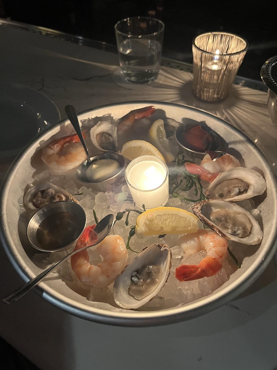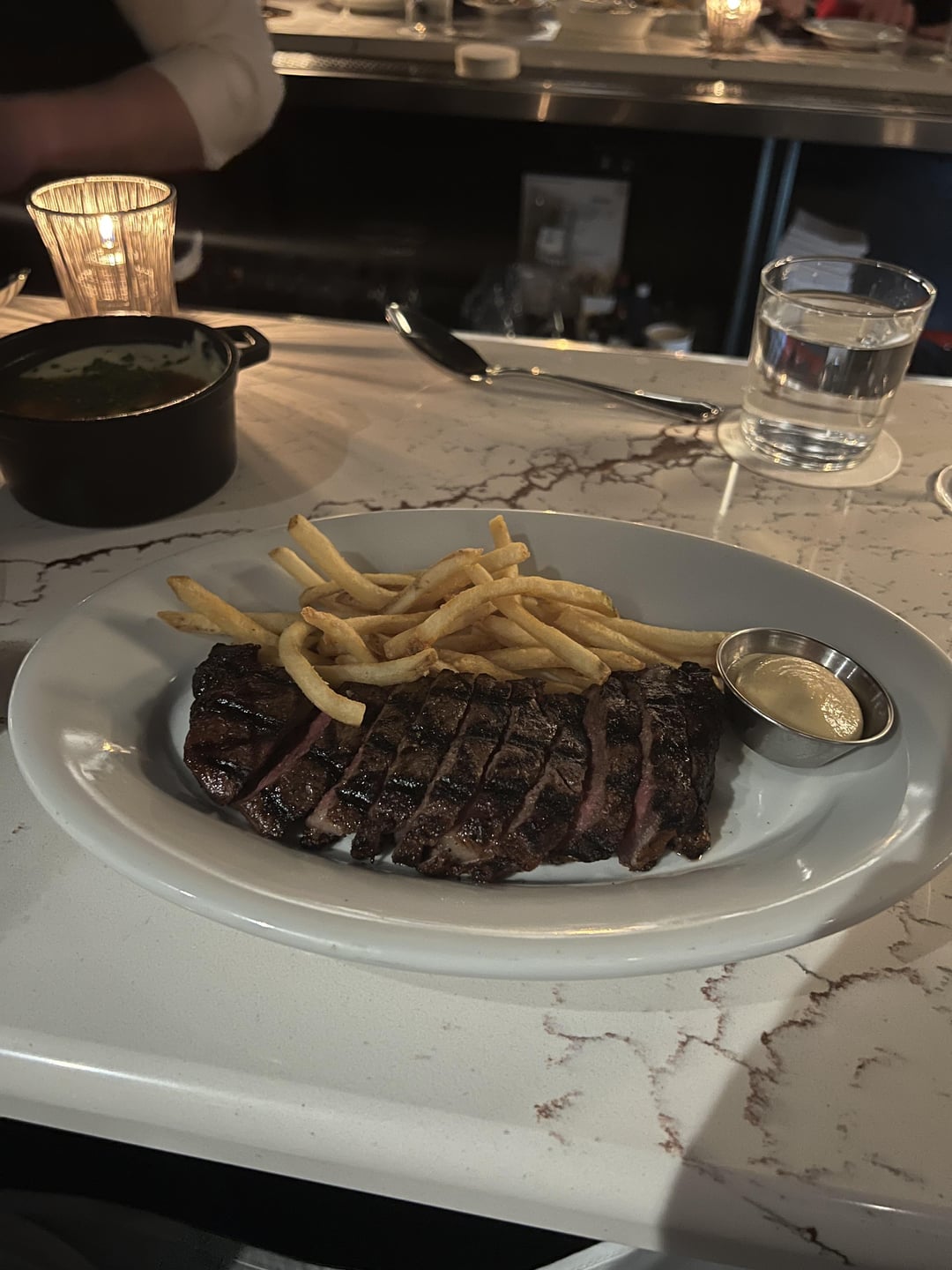 We got in for a 7PM res and the restaurant was mostly full. It was entirely full by 8. The hostess took our coats and we got sat in our bar seats (we had a specific bar reservation instead of a dining room reservation).