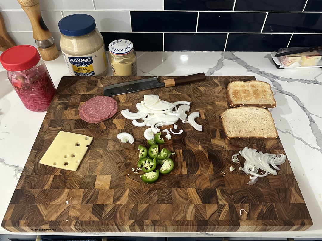 Idiot_Parfait 10 months ago Pickled and grilled onions and jalapeños seems like a fantastic combo. Definitely adding this sandwich to the TBE (to be eaten).