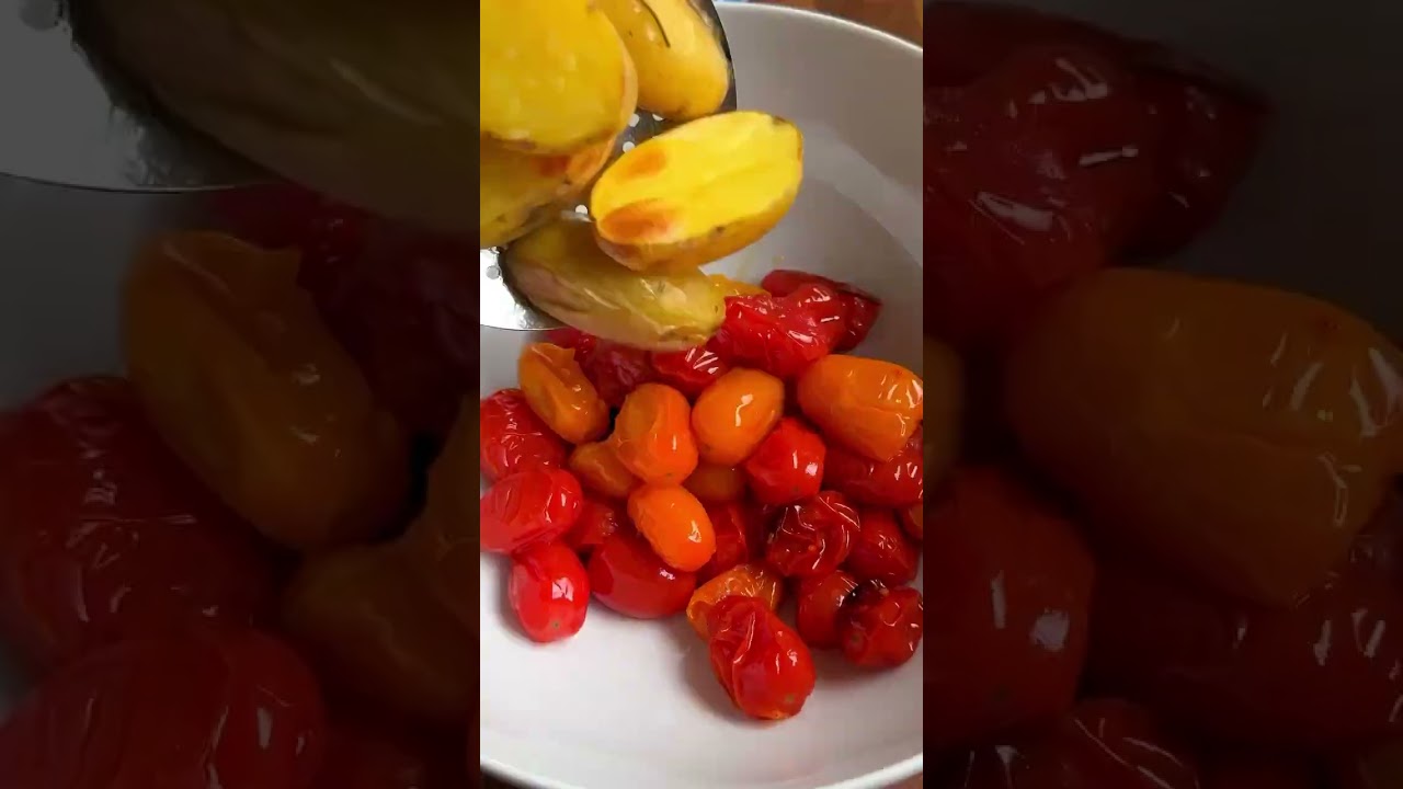 Creamy Roasted Cherry Tomatoes and Red Pepper Soup Ingredients – For the soup – 300g cherry tomatoes 1 red pepper, cut into quarters, seeded 3 small potatoes, peeled and cut into cubes 1 onion, cut in half 2 heads garlic, cut to reveal cloves 2 sprouts