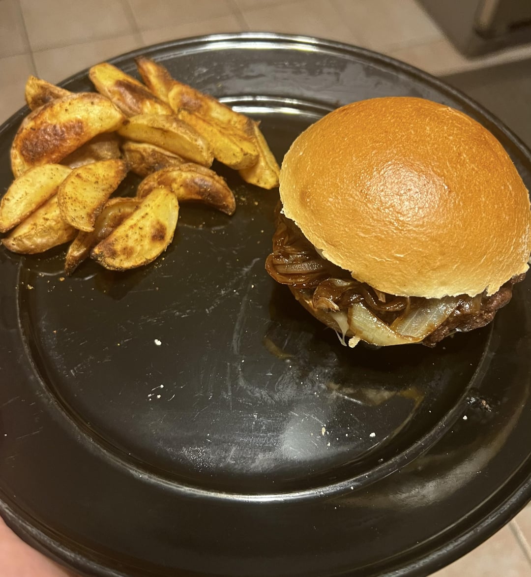 with Onion jam, Garlic Mayo, and crispy potato wedges
