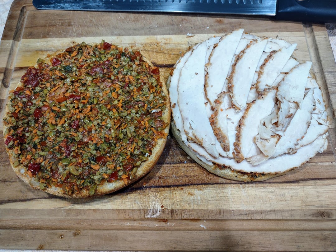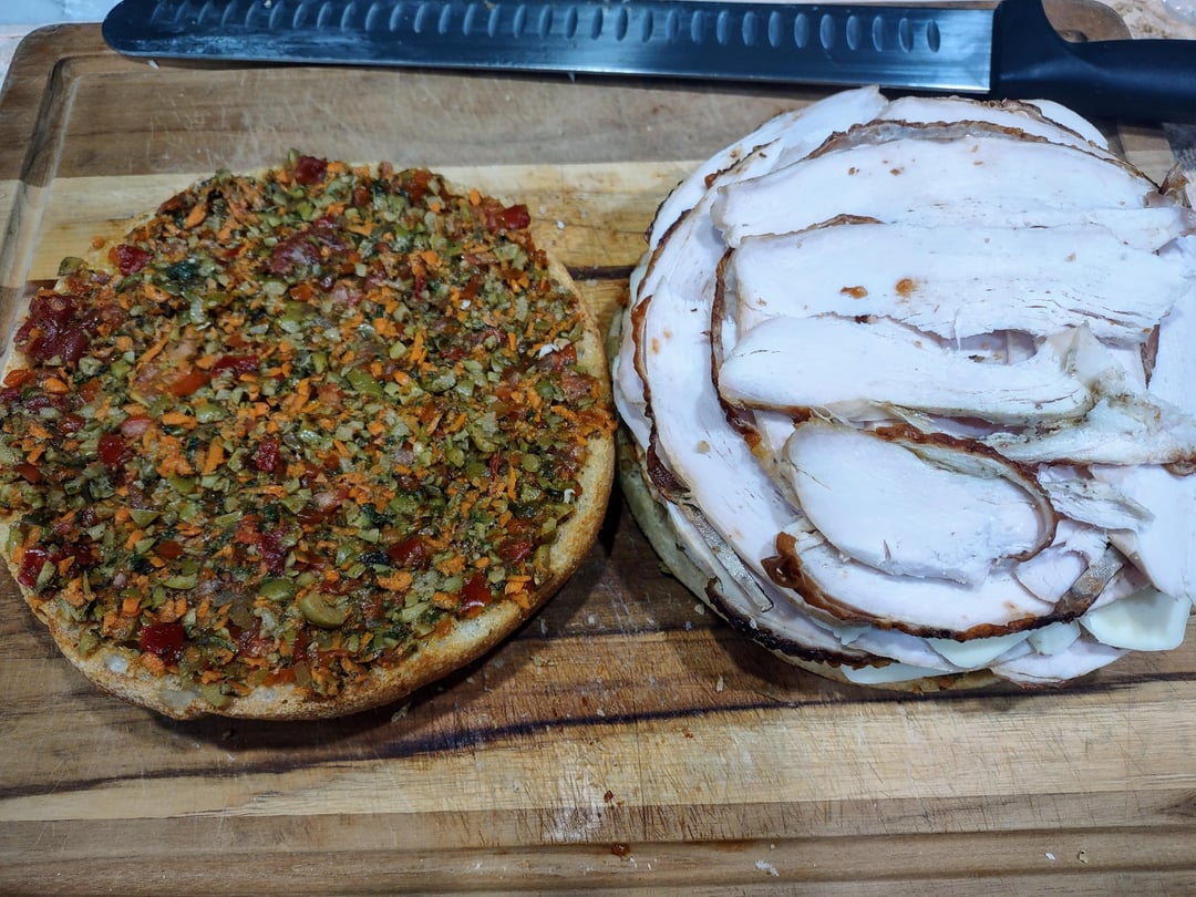 • Roasted Chicken, Rotisserie Turkey, Provolone Cheese, and Olive Salad (Pimento Stuffed Green Olives, Carrots, Pickled Bell Peppers & Onions, Capers, Garlic, Red Wine Vinegar, Olive Oil, Parsley, Oregano, Lemon Juice, and Black Pepper) on Focaccia Bread.