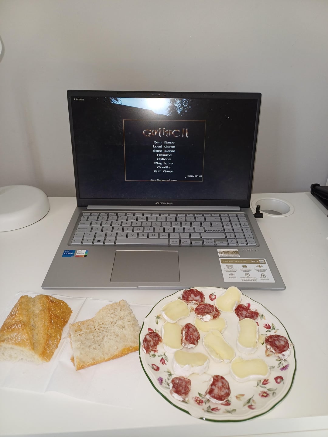 A humble yet satisfying plate: freshly baked bread with a crusty outside and soft, airy inside, paired with slices of creamy brie and fuet.