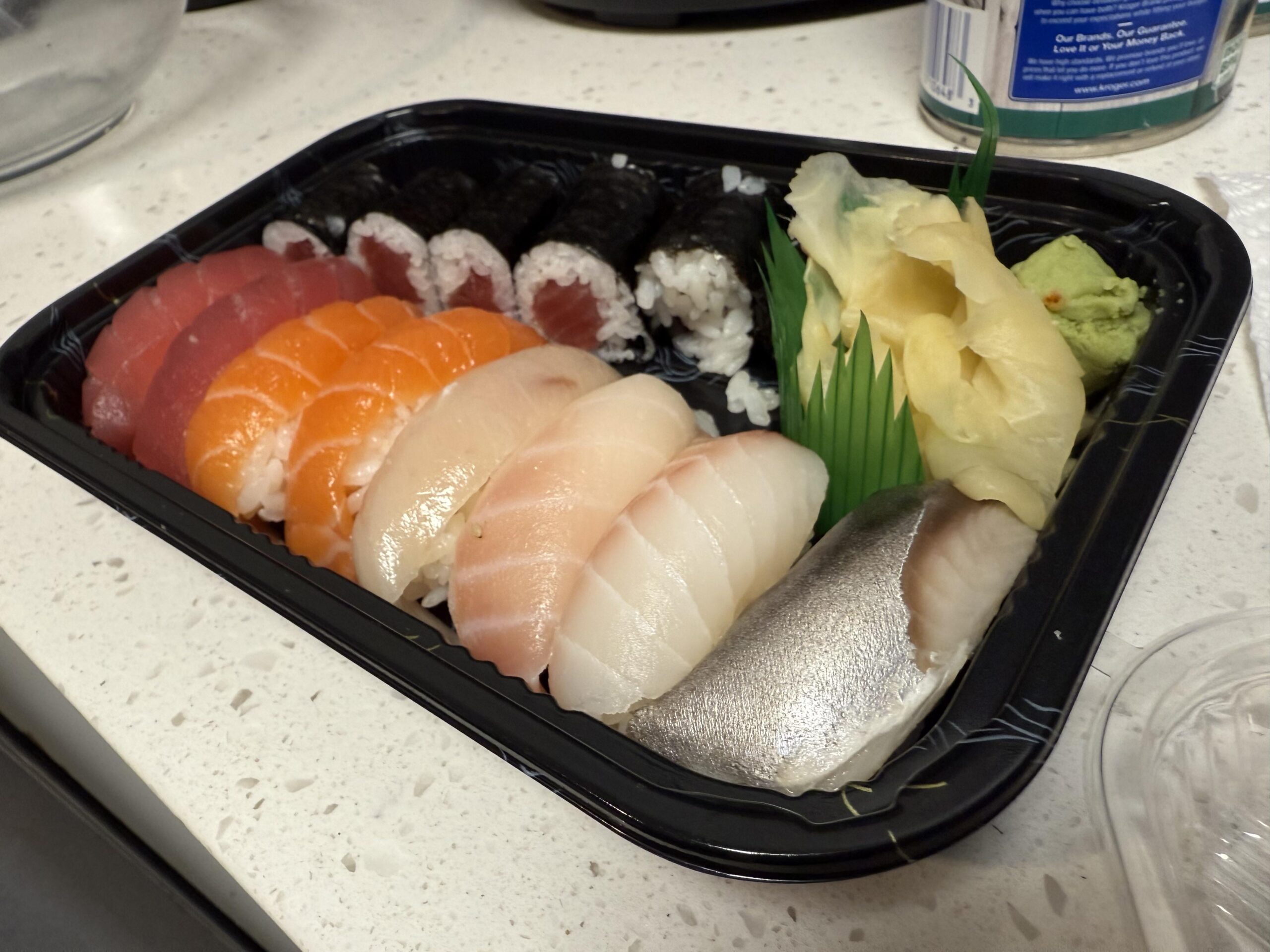 Mackerel. It’s a big family. They’re all related, e.g., horse mackerel. There’s also shad (not sure if gizzard shad is the same or a fancier name; I’m no expert) and sardine. But at that price point, probably a version of mackerel. It’s called saba in Japanese. They wouldn’t give you anything exotic in a pre-packaged box.