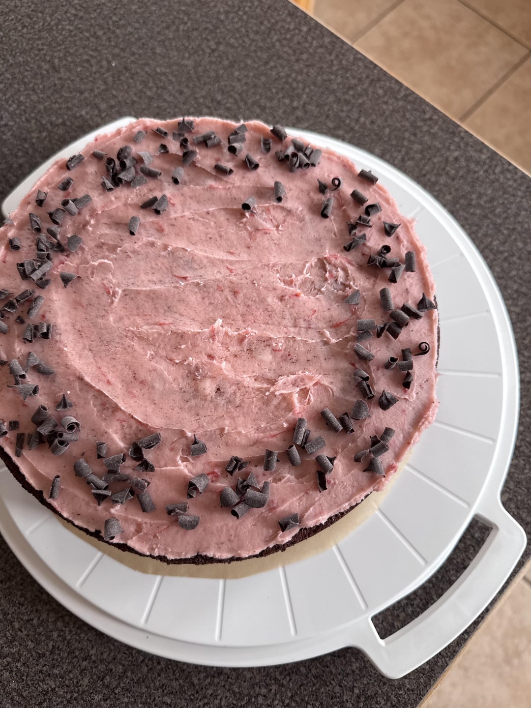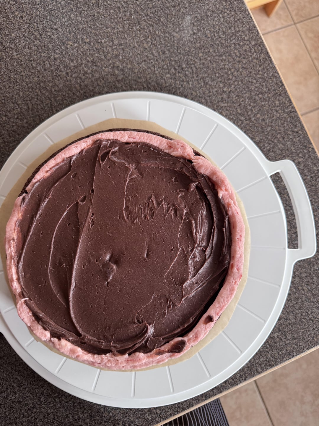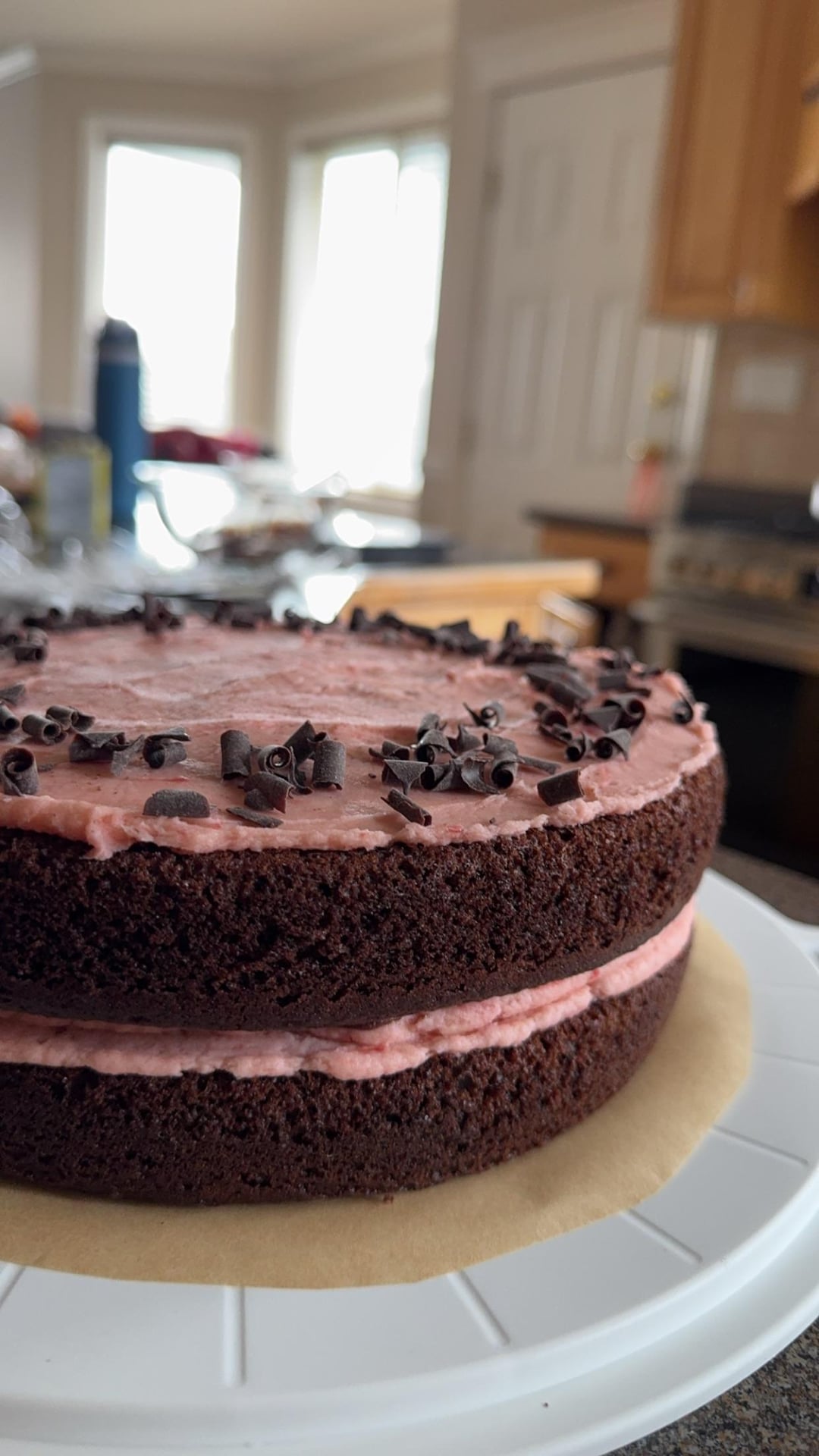 Hey! So I made this 9 inch two layer gluten free chocolate cake with ganache filling and strawberry buttercream. The total cake weighs 1650g and we cut it into 12 slices. I calculated the calories but was curious what this group might guess it as!