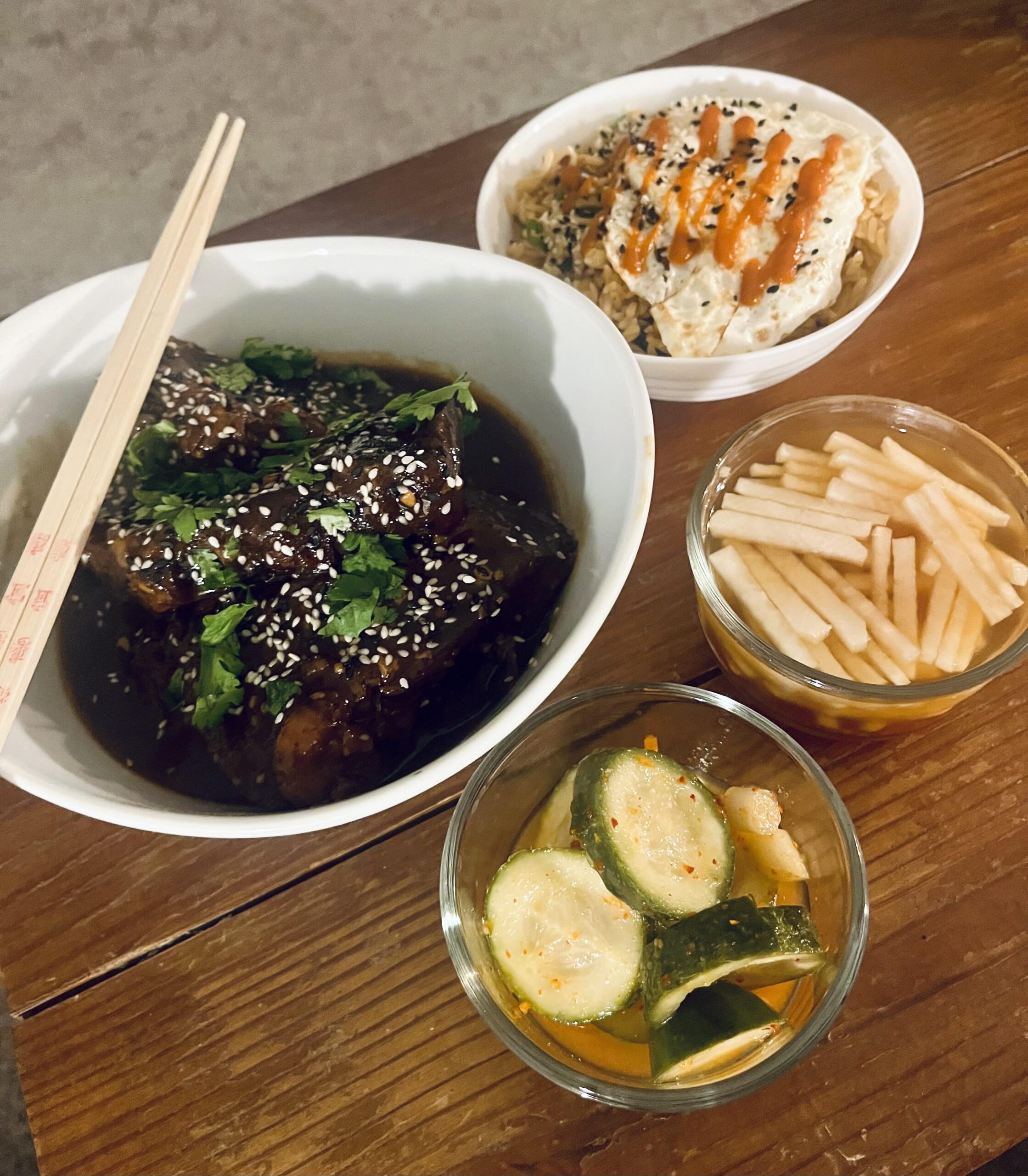 Made braised Dutch oven Korean short ribs, kimchi fried rice, marinaded diakon, and kimchi pickles for dinner!by Bern_itdown 1 Comment JuniperSprigg 1 year ago Would you mind sharing the recipe? It looks so good!Write A CommentYou must be logged in to post a comment.