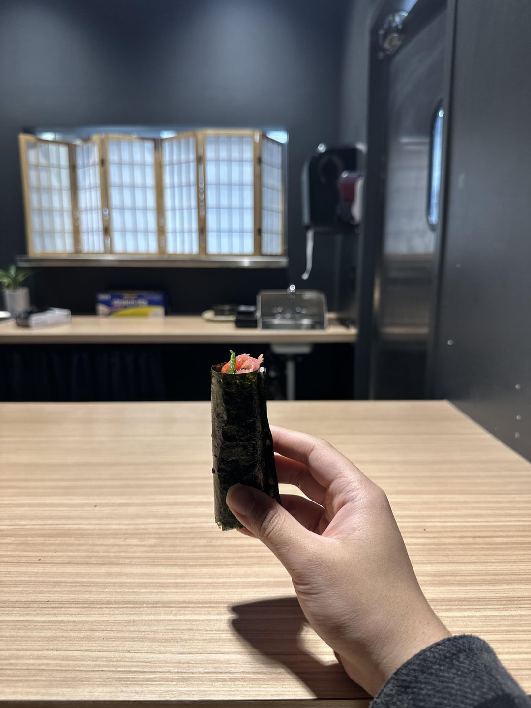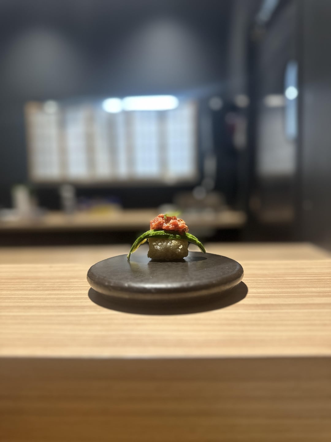 - Tuna tatare handroll – taniki tuna belly with green and caviar