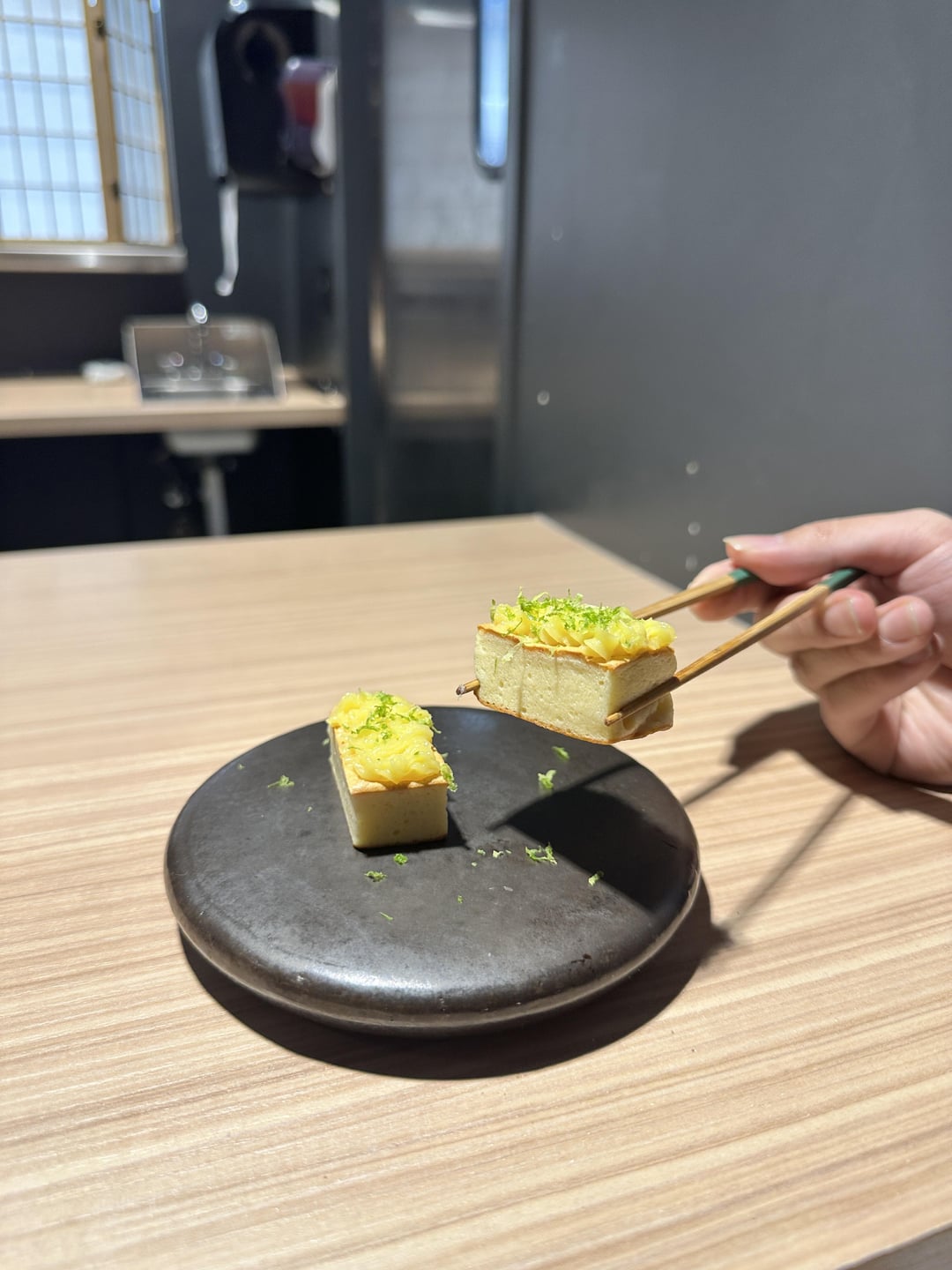 - Gyoku – sponge cake, tamagoyaki egg curd with lime zest and some sort of sweet cream topping