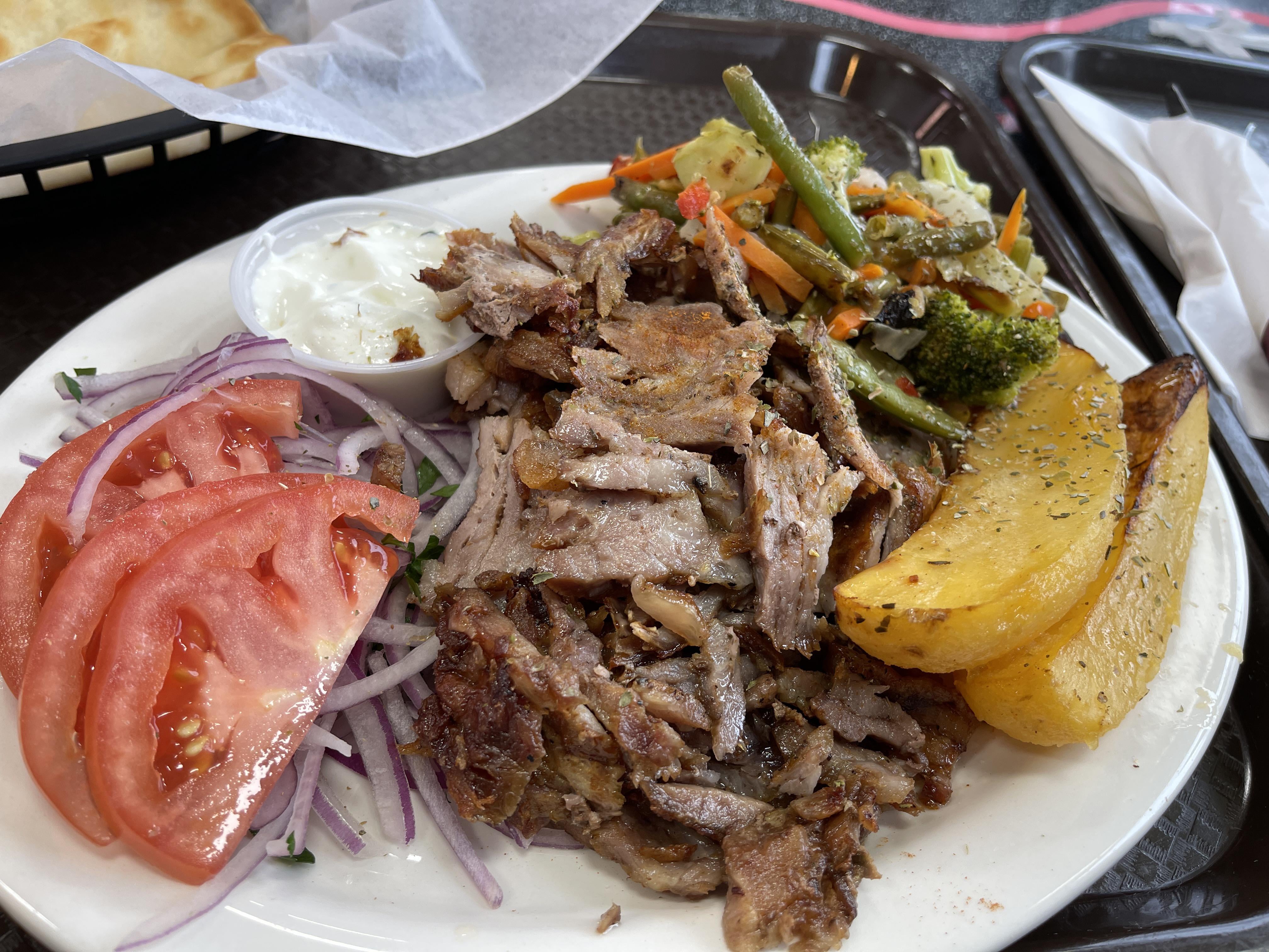 First time for Greek gyros rather than βGreekβ gyros. Pork is this one vs lamb & beef. Tender, juicy, delicious. Comes with Greek potatoes, veggies, soup (or salad), and pita. 2 or 3 meals depending on how hungry you are.