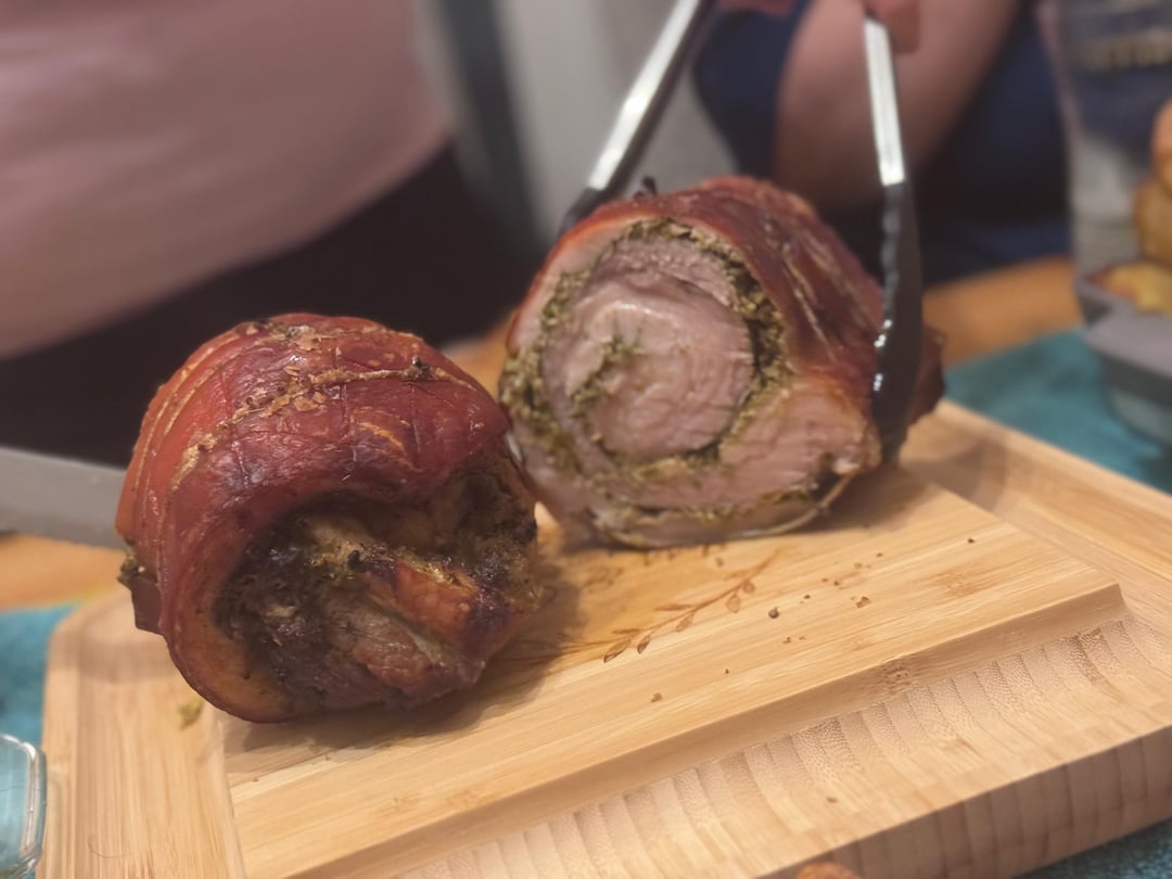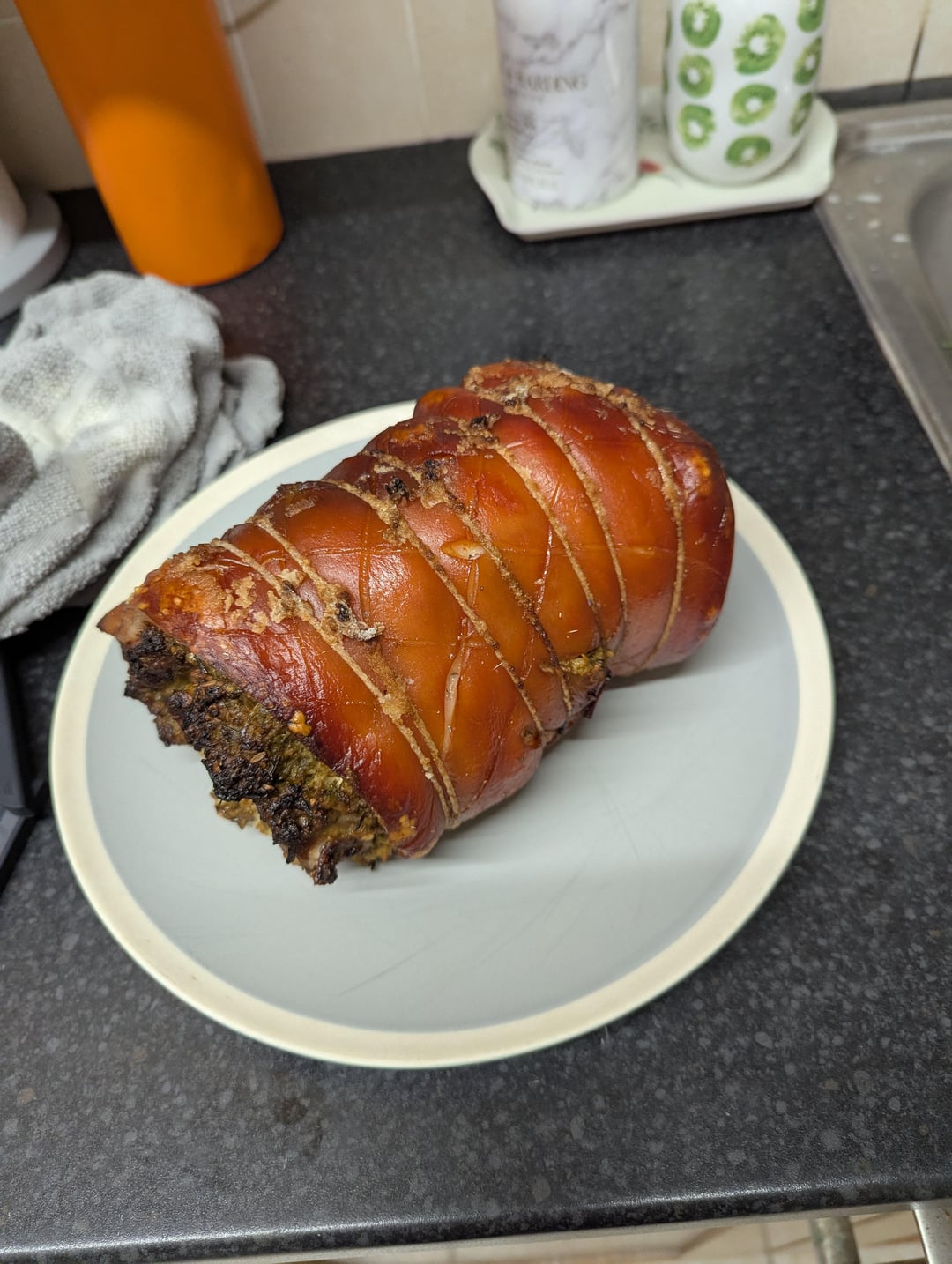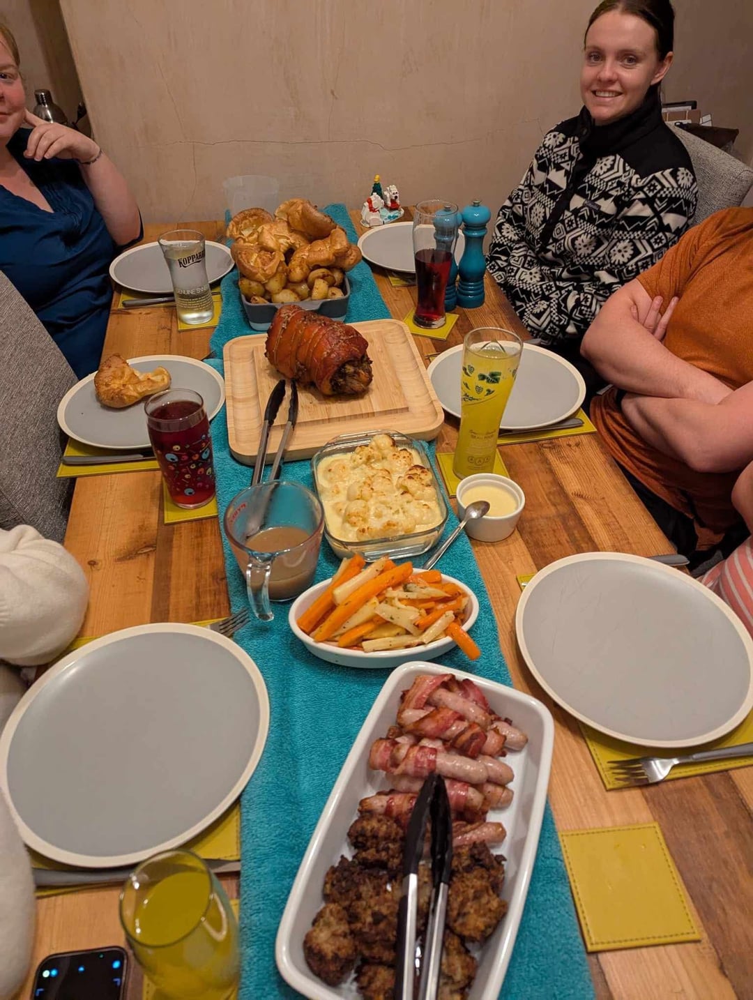 The main was basically a big roast with porchetta, pigs in blankets, stuffing balls, Yorkies, toasties, honey and thyme carrots and parsnips, cauli cheese.