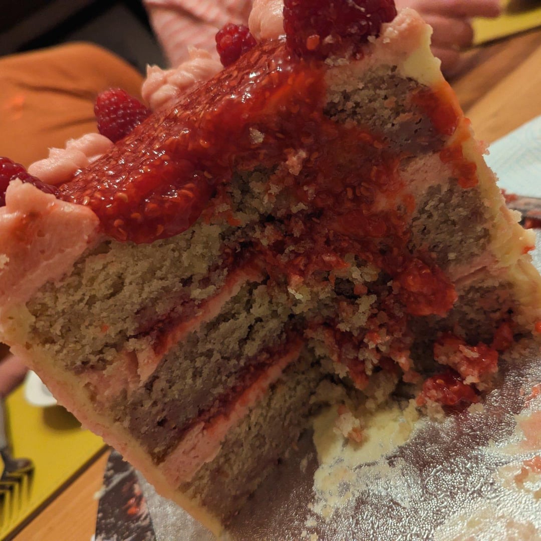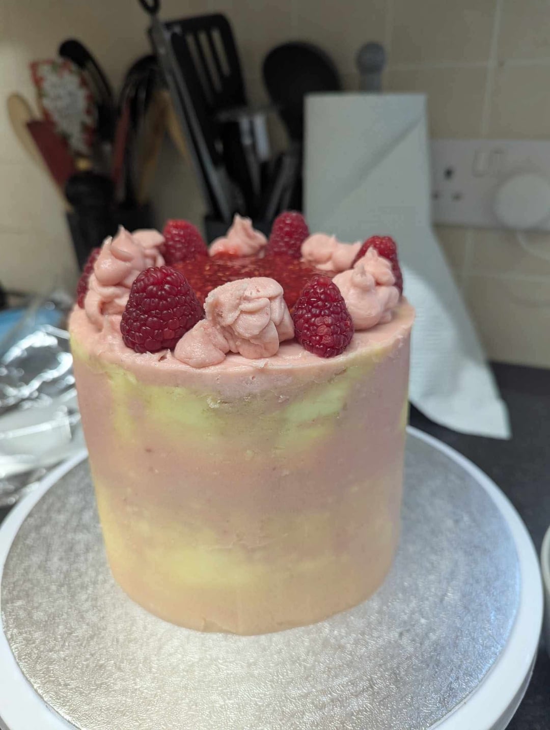 The dessert was a raspberry and lemon cake. First time I've decorated a cake and my pipping nozzles were too narrow for the thickness of the butter cream so I ended up with little poops on top lol