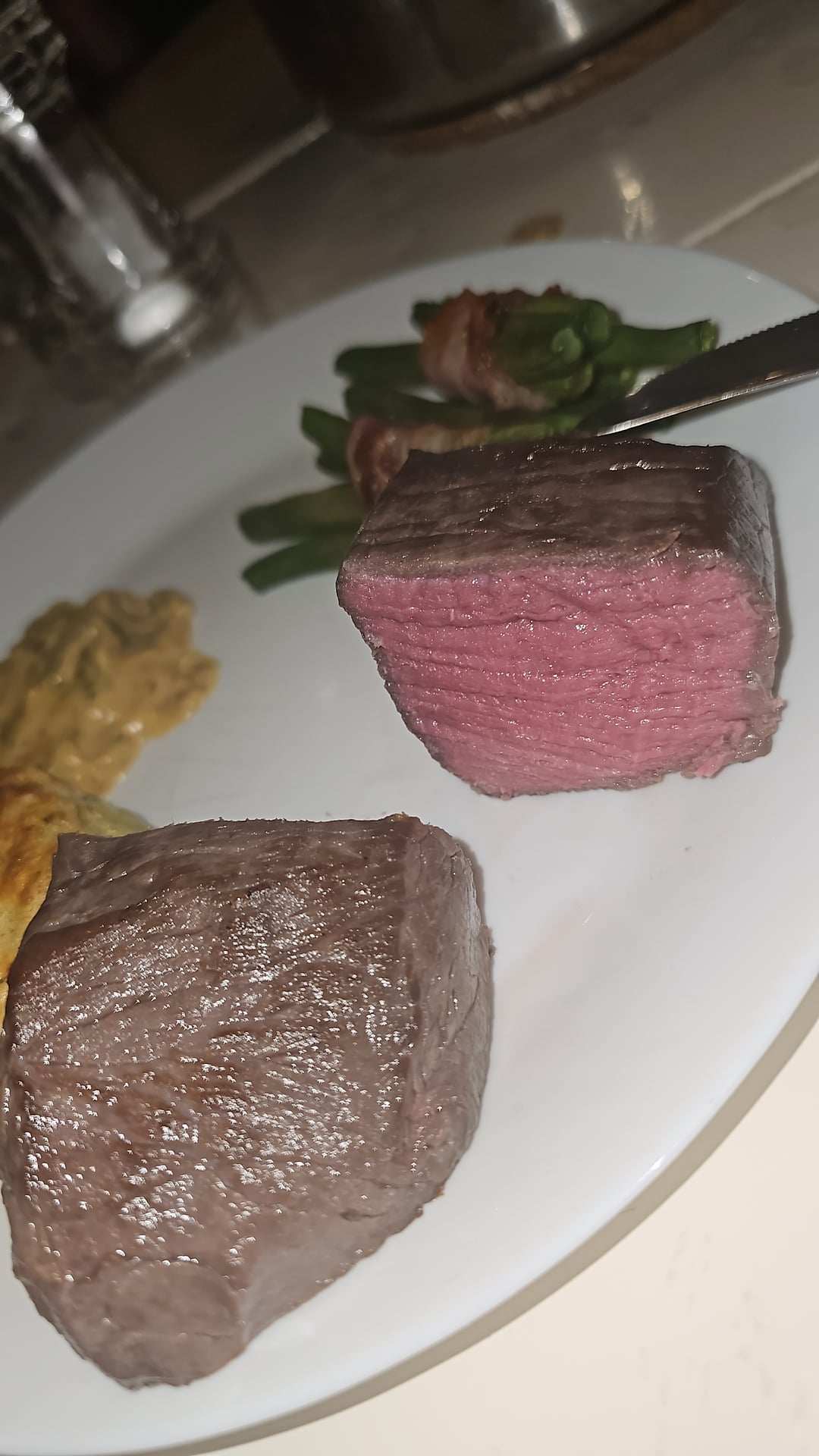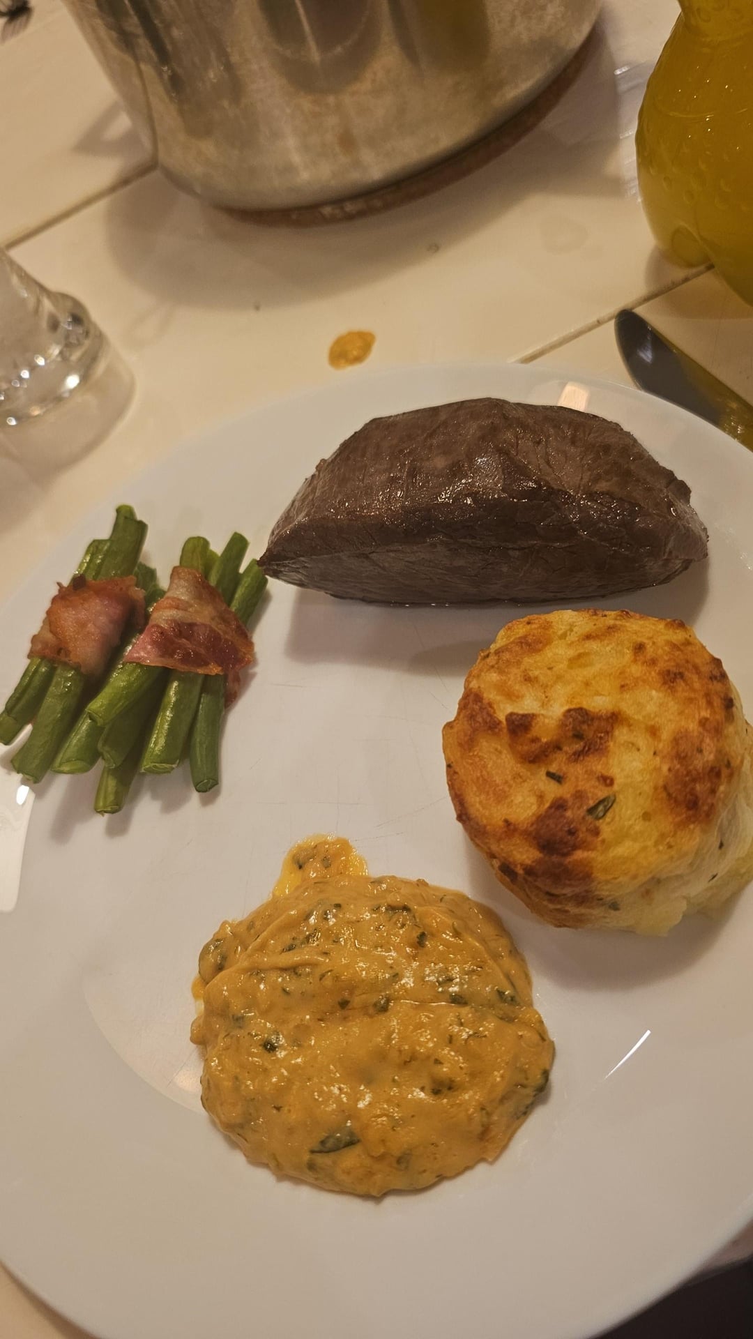 Made a homemade Béarnaise sauce, with potato gratin and bacon-wrapped green beans.